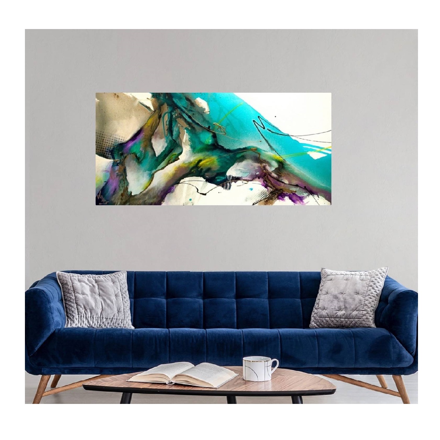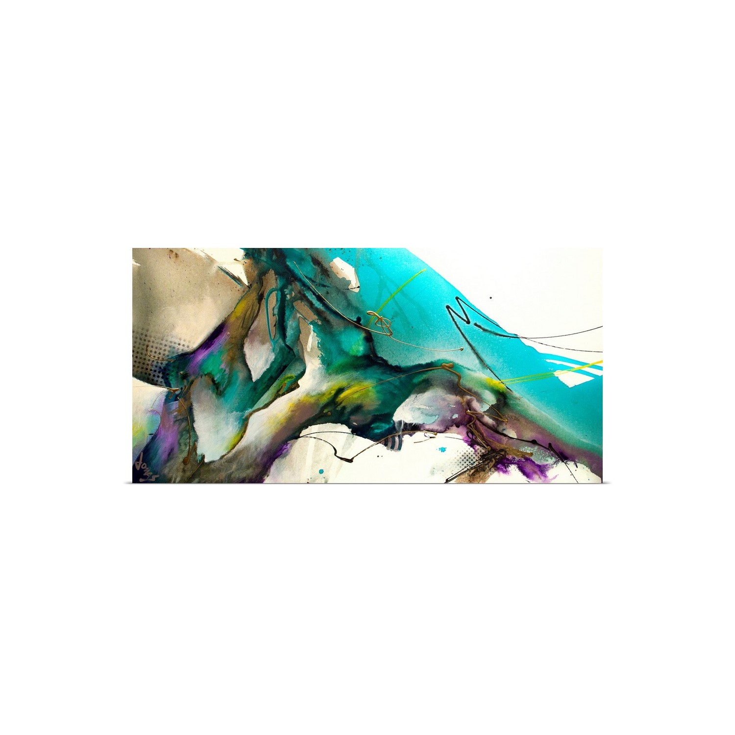 Trust the Flow, by Jonas Gerard, is an abstract work full of jewel-toned hues and dynamic movement. Vivid blue, green, purple, yellow, and brown converge and cascade over a white background. A glossy surface augments the vibrancy and energy of this contemporary artwork, further enhanced by a turquoise Zenith frame with two diagonal silver accents.