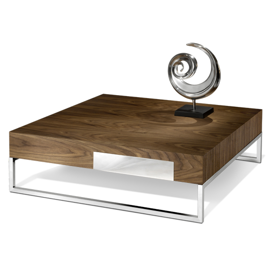 The Tully Coffee Table is spacious and low to the ground -- ideal for complementing any of our contemporary sectionals. The richness of the walnut wood is accentuated by a chrome drawer and base, which lines the bottom of the rectangular tabletop to create a striking border.