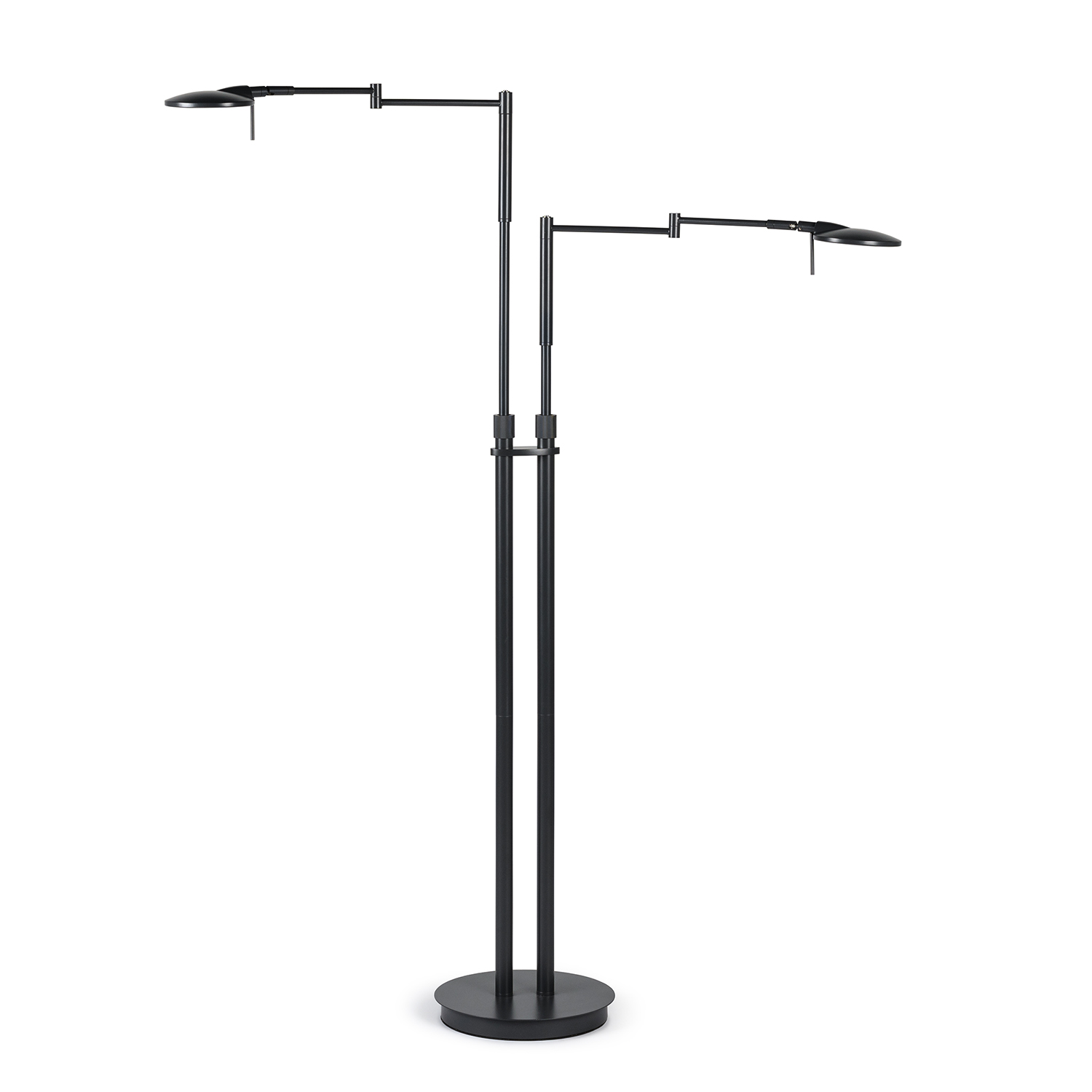 [0] => The Turbo Double Floor Lamp, available in black, is designed for optimum use, with two swing arms that are adjustable in any direction. LED and energy efficient, this lamp features dimming capabilities, allowing you to brightly light your task, or create a subtly-lit ambiance. An easy way to add more light to your space.
