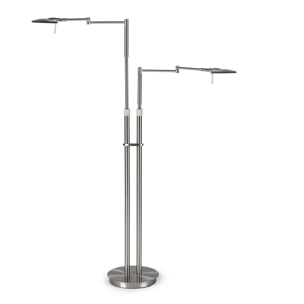 [0] => The Turbo Double Floor Lamp features a lamp shade on either side, allowing it to illuminate multiple spaces at once. The silver metal structure has clean lines, different height levels, and small handles to easily accommodate your desired lighting.