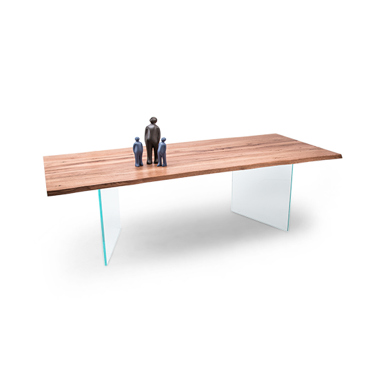 [0] => The Twins dining table, made in Italy, features stunning contemporary design that merges art with nature. A solid oak tabletop with a natural gap floats on clear glass legs, creating a clean, rich look. Pair with a nautral wood sideboard or buffet for a complete look.
