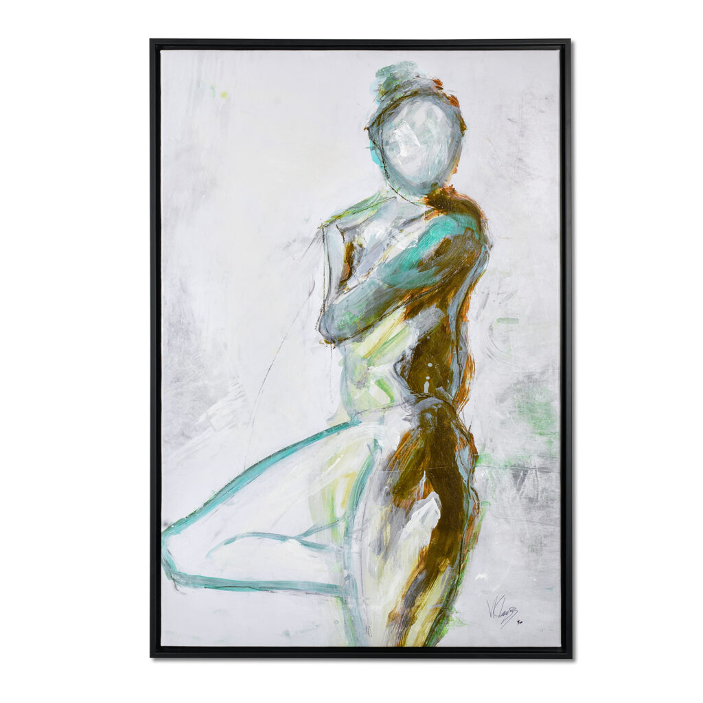 [0] => The Two Nailheads Wall Art depicts a human form against a textured grey backdrop. Cool turquoises and warm browns create the outline and shadows of the body, establishing a piece that is rooted in subtle movement and form. Artwork on canvas by V. Klauss with a black floater frame.