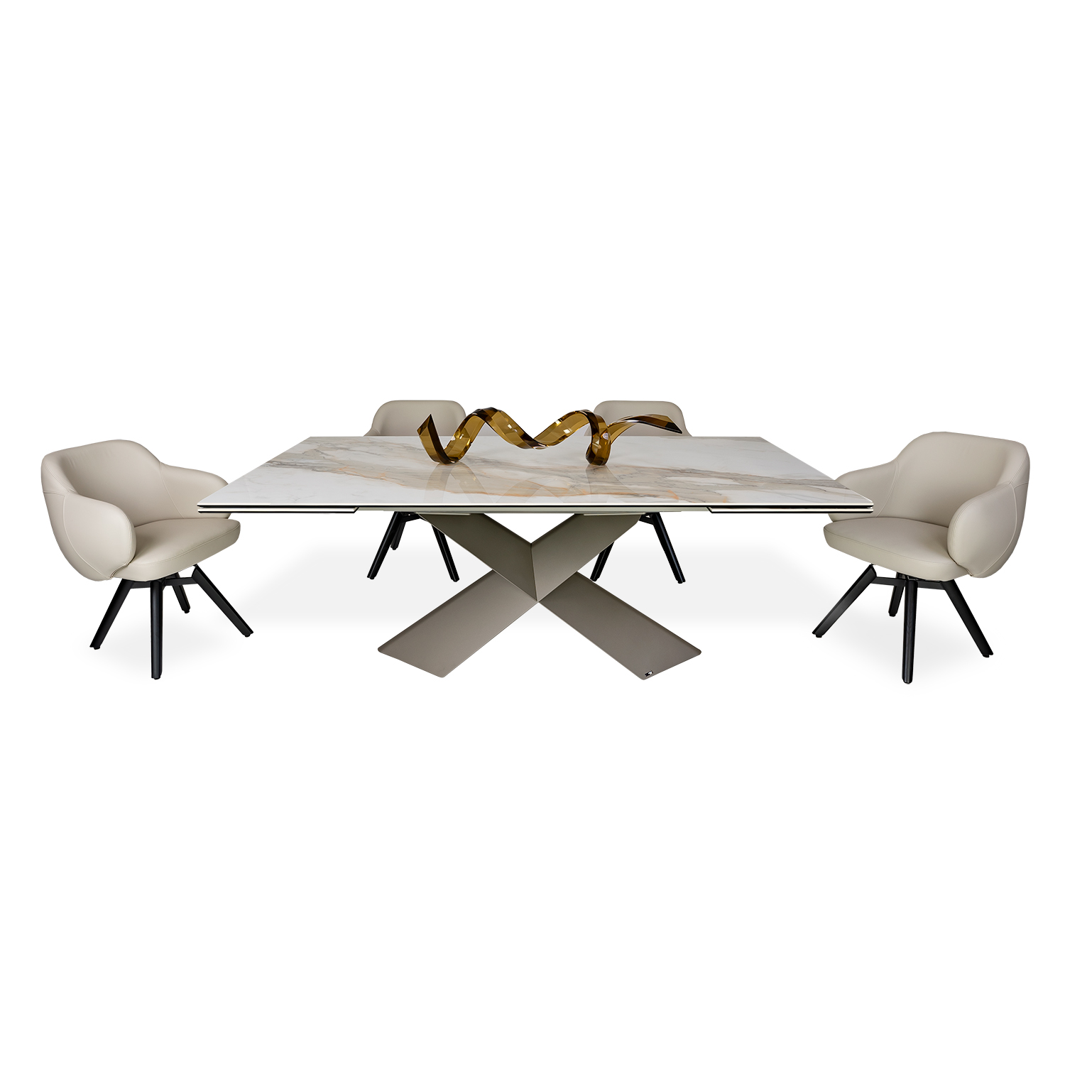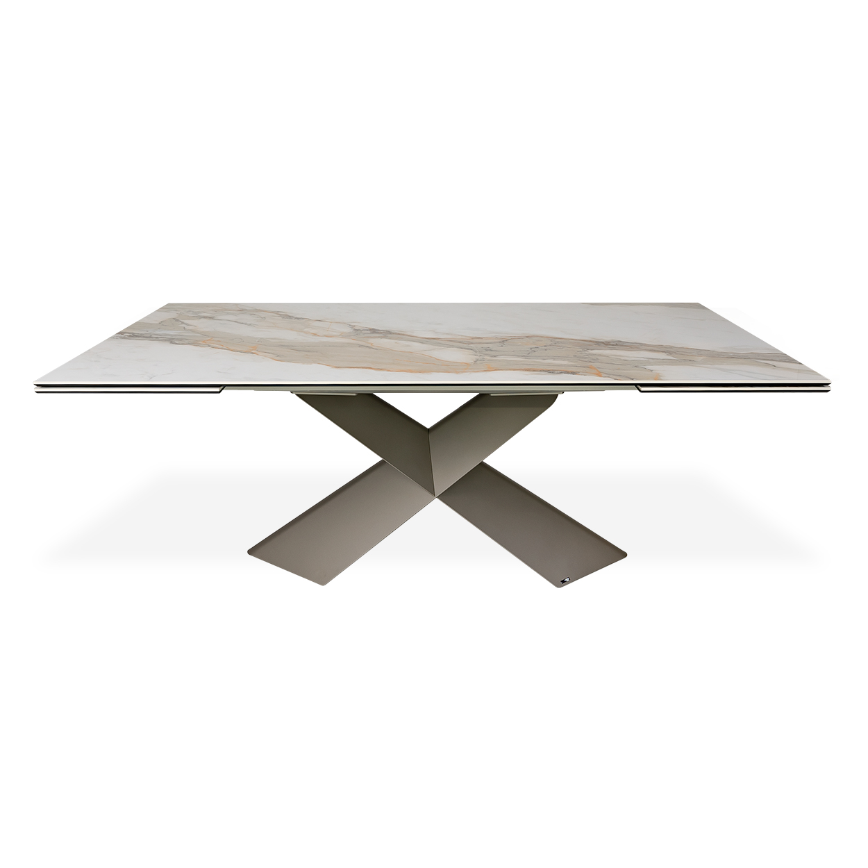 Entertain at a dining table that will captivate your guests. Made in Italy, the Tyron Keramik Dining Table has an x-shaped base wrought from titanium embossed steel and designed to impress at any angle with its fusion of sharp and rounded triangular lines. The glossy tabletop is crafted from ceramic marble and features elegant beige and grey veining on an off-white background. Self-storing extension leaves allow Tyron to accommodate even the largest banquets with ease.