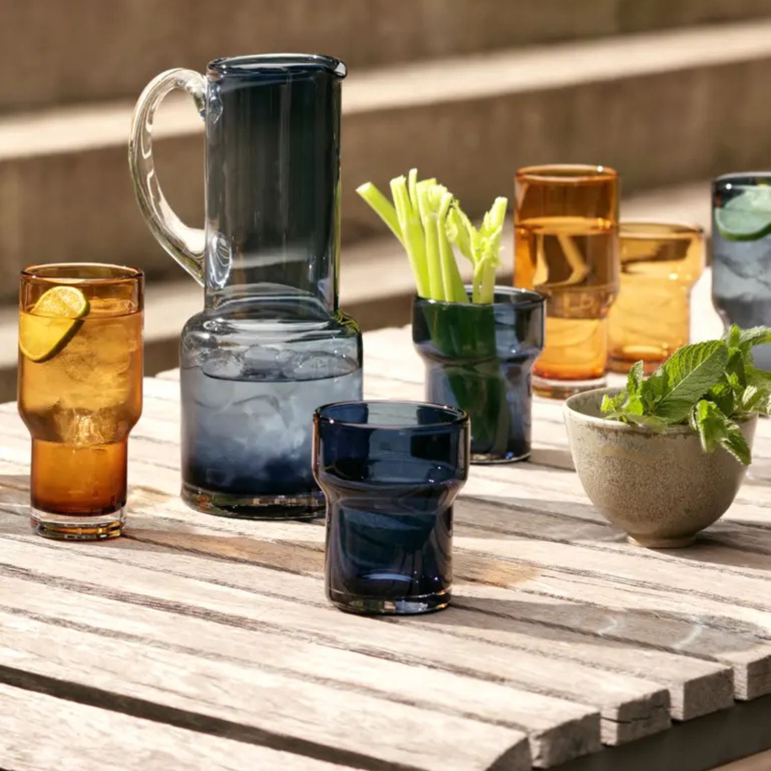 [0] => The Utility Highball Glasses are made of mouth-blown glass in amber brown and feature a modern stepped shape with thick walls and a soft, melted rim. Sold as a set of 2, these glasses can elegantly hold a variety of beverages for everyday use or special dining occasions.