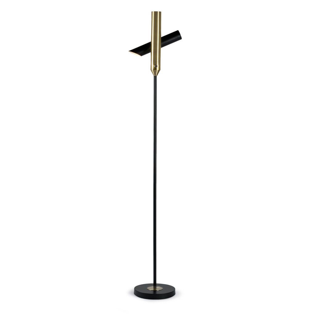 The Vega LED Torchiere features black and antique brass metals that mix together to create a sleek, refined silhouette. A 4-way touch switch adjusts the light to four different settings, and the adjustable lamps allow this piece to fit in any space or angle. This lamp will add a mid-century modern spark to your home or office environment. Vega has a 60" black cord and its LEDs have a color temperature of 3,000K and a lifespan of 50,000 hours.