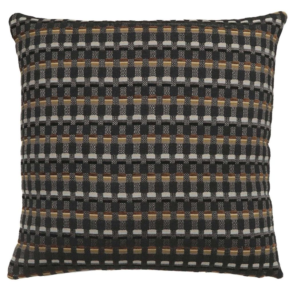 The Venetto Pillow features a grey cover with a chic gridded pattern that instantly catches the eye. Grey checkered squares contrast with alternating lines of striped squares threaded in shades of brown, darker grey, and beige. A feather filling gives this pillow a satisfying plumpness, while a discreet zipper allows the cover to be removed for spot-cleaning if needed.