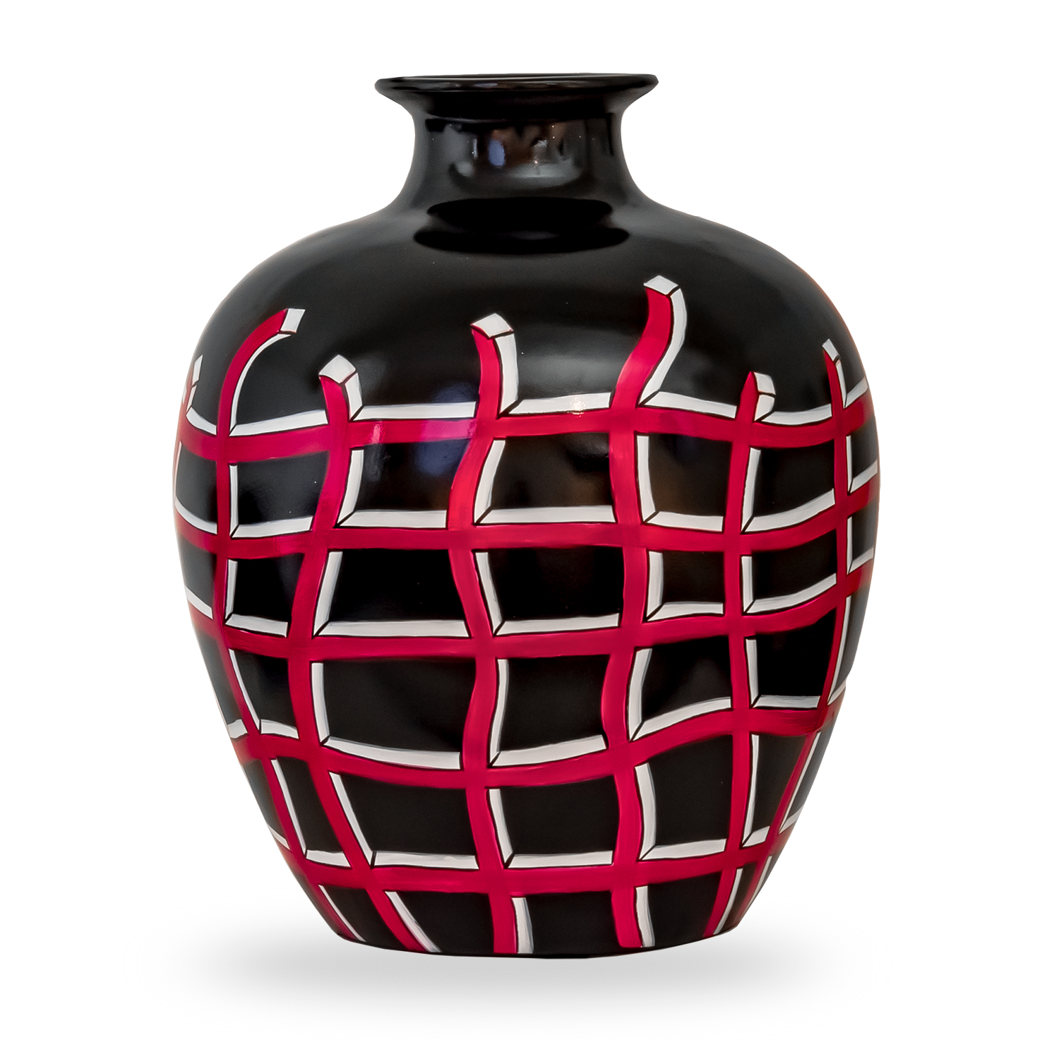 The Veranda Vase has a bold color scheme and funky pattern that will add pizzazz to any modern interior. This piece features hand-painted red and white lines that curve and intersect in a trellis pattern on a black background. Crafted from porcelain, Veranda has an elegant urn shape that makes it equally suitable for holding a bouquet or being displayed on its own.