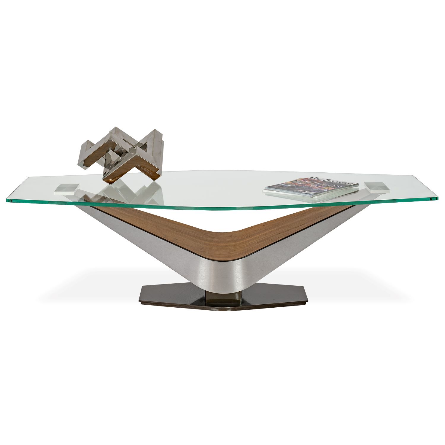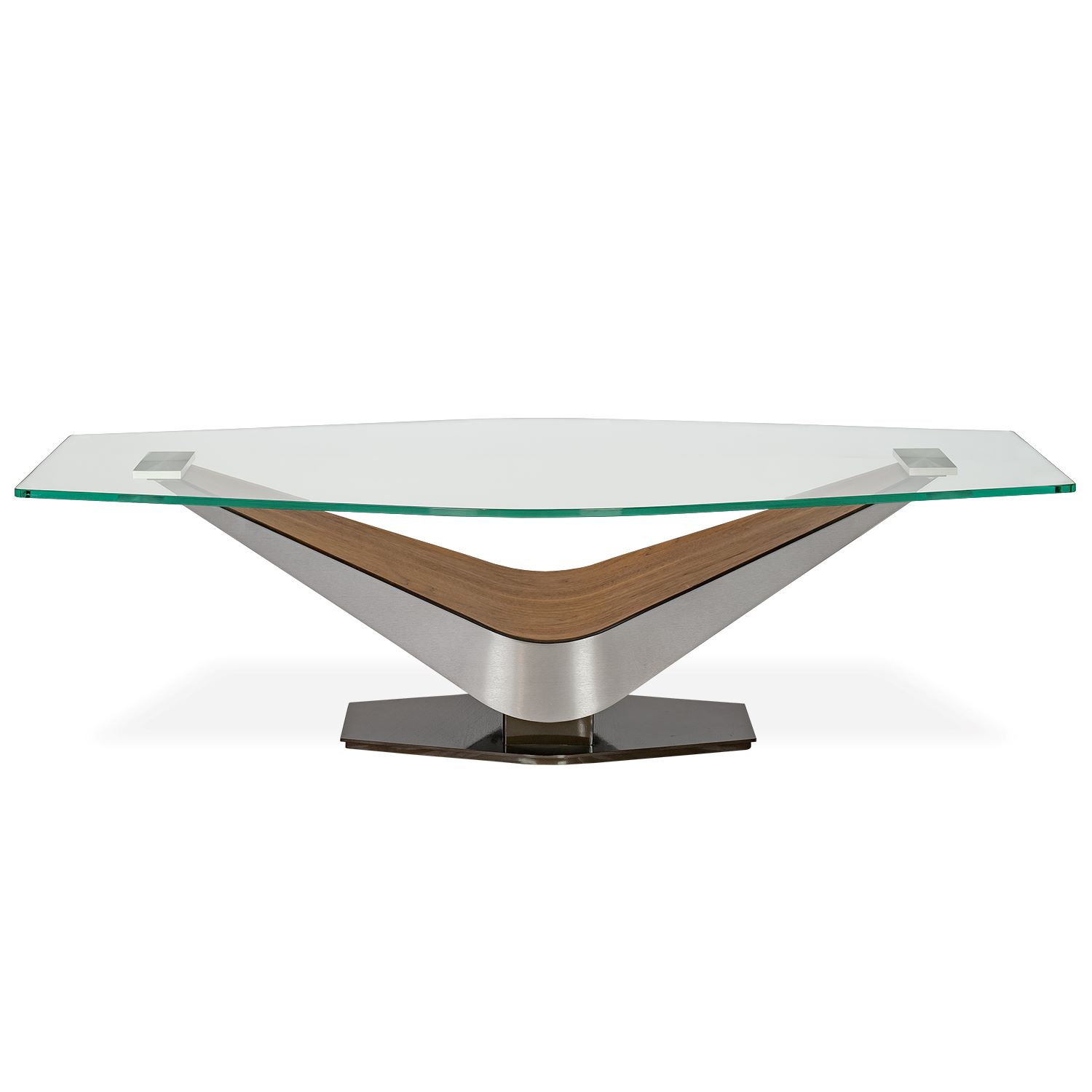 The Victor Coffee Table has a sculptural, show-stopping design, with a sweeping v-shaped base in walnut and natural steel. Victor's clear glass top has a hexagonal form with crisp corners and soft, rounded sides that form both a complement and contrast to the triangular base below. This table makes an artistic statement and will be the highlight of your living space.