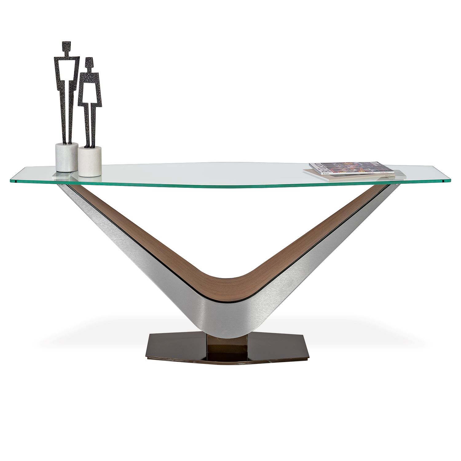 [0] => The Victor Console Table has a sculptural, show-stopping design, with a sweeping v-shaped base in walnut and natural steel. Victor's clear glass top has a hexagonal form with crisp corners and soft, rounded sides that form both a complement and contrast to the triangular base below. This table makes an artistic statement and will be the highlight of your living space.