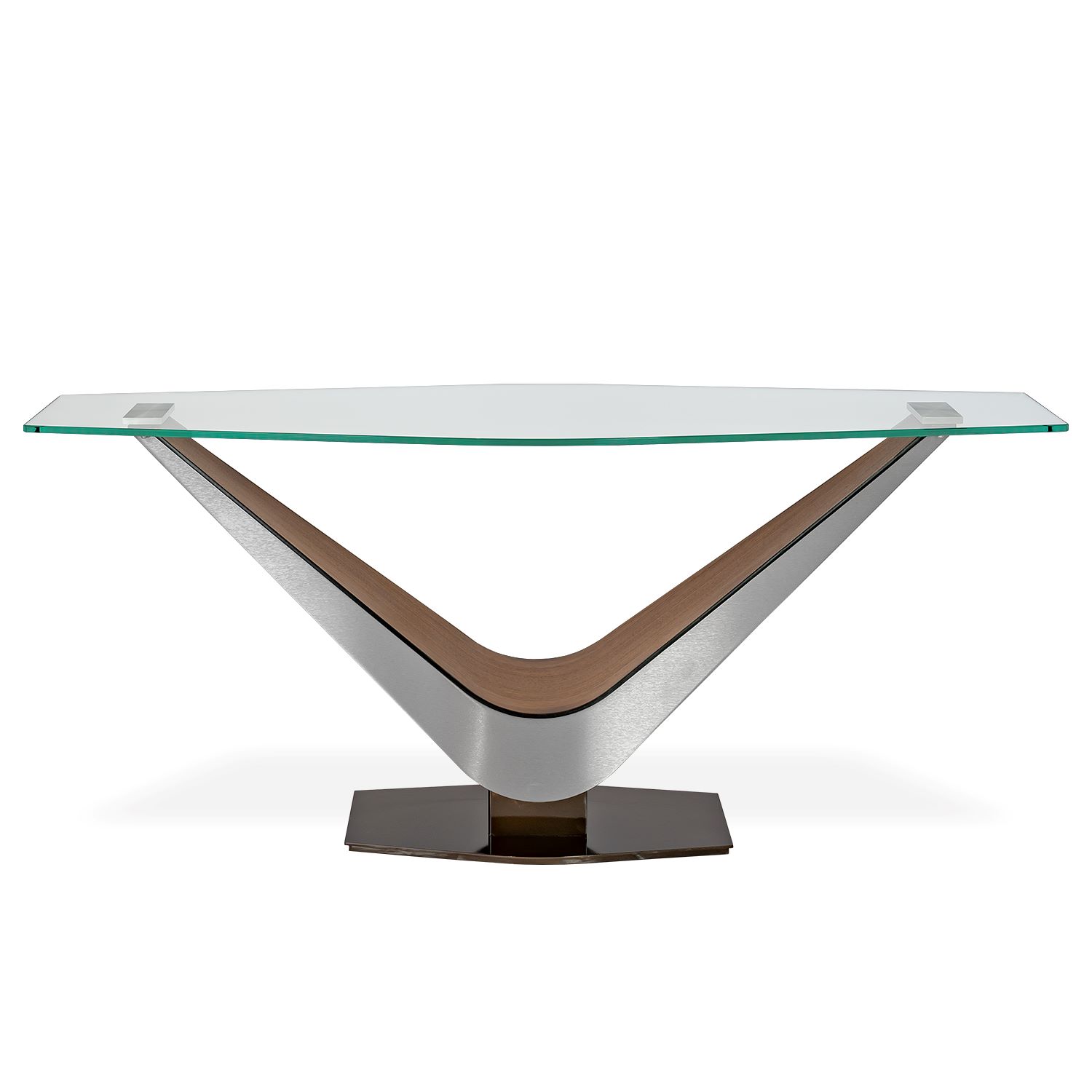 The Victor Console Table has a sculptural, show-stopping design, with a sweeping v-shaped base in walnut and natural steel. Victor's clear glass top has a hexagonal form with crisp corners and soft, rounded sides that form both a complement and contrast to the triangular base below. This table makes an artistic statement and will be the highlight of your living space.