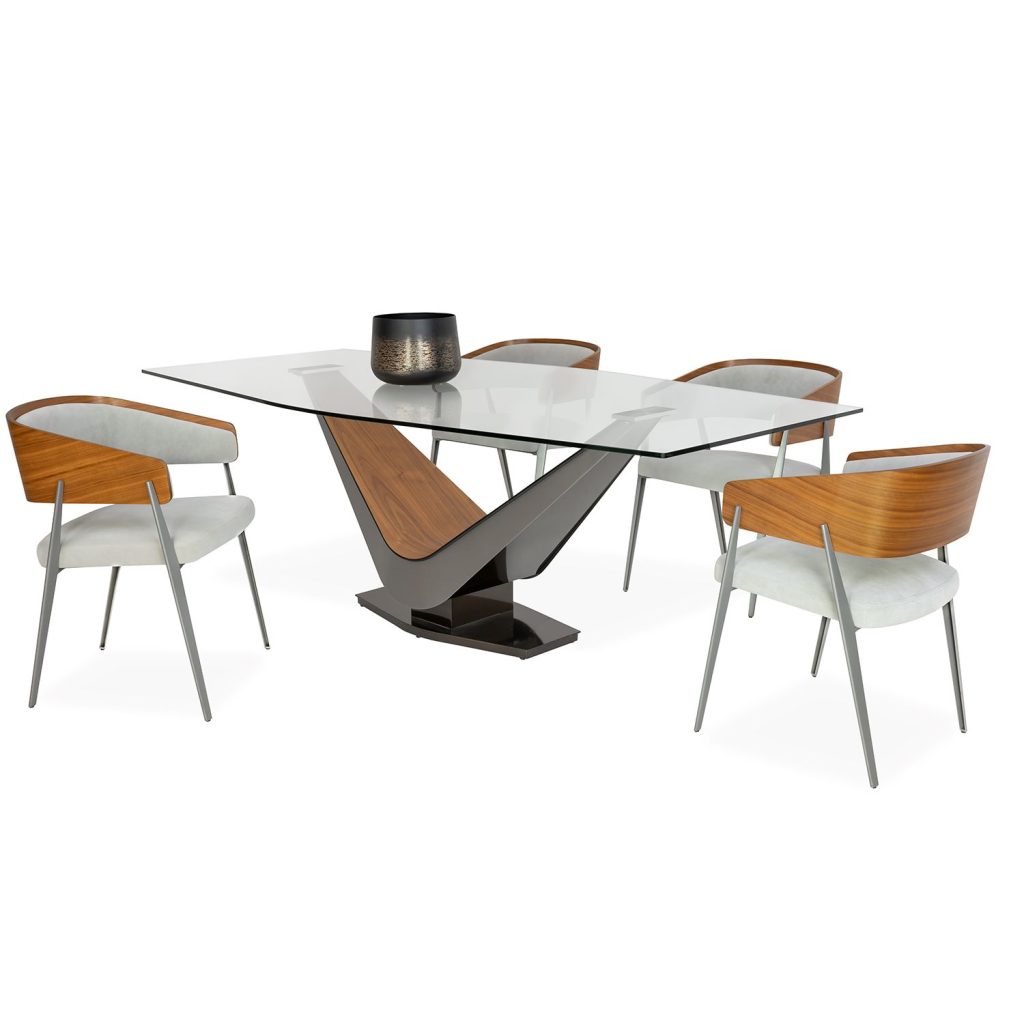 The Victor Dining Table has a sculptural, show-stopping design, with a sweeping v-shaped base in walnut and natural steel. Victor's clear glass top has a hexagonal form with crisp corners and soft, rounded sides that form both a complement and contrast to the triangular base below. This table makes an artistic statement and will be the highlight of your dining space.