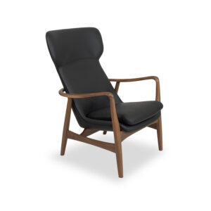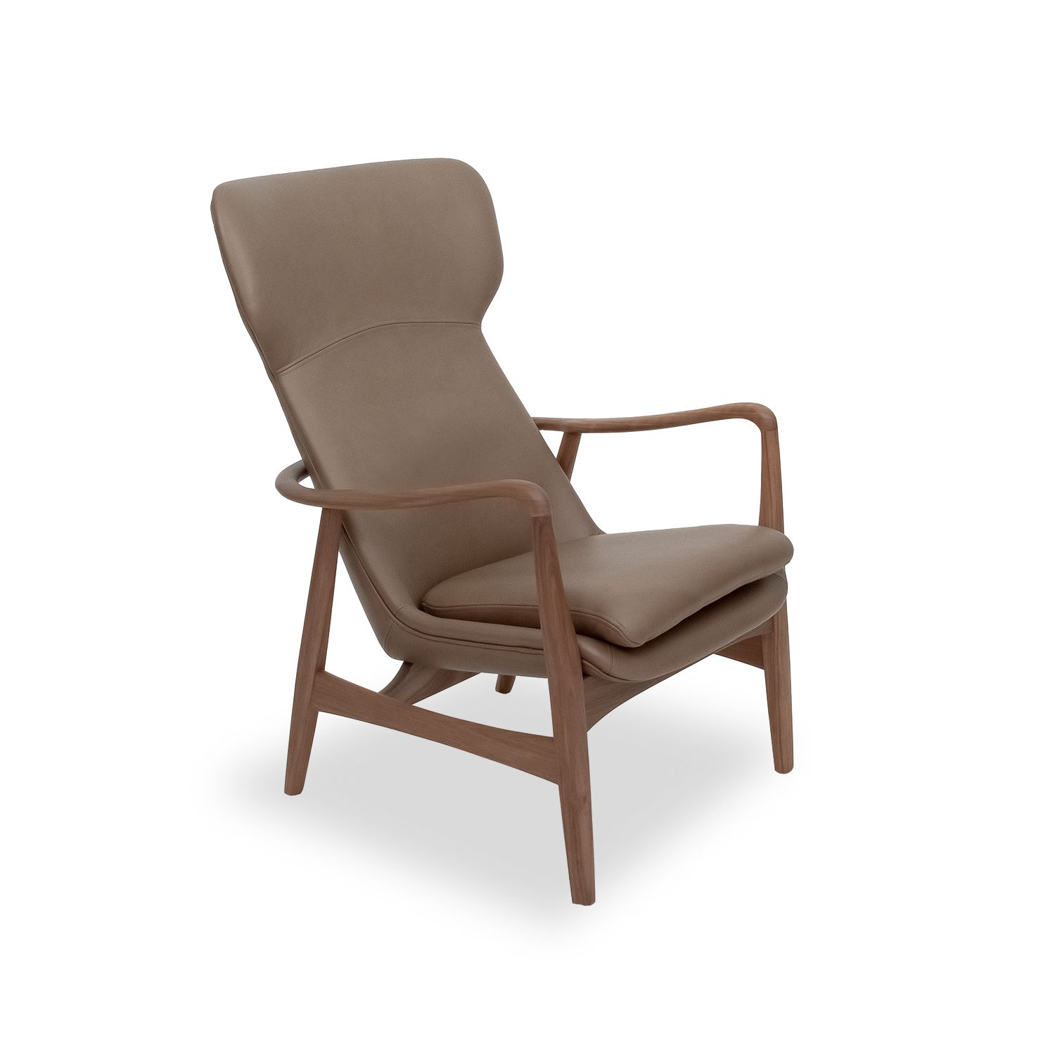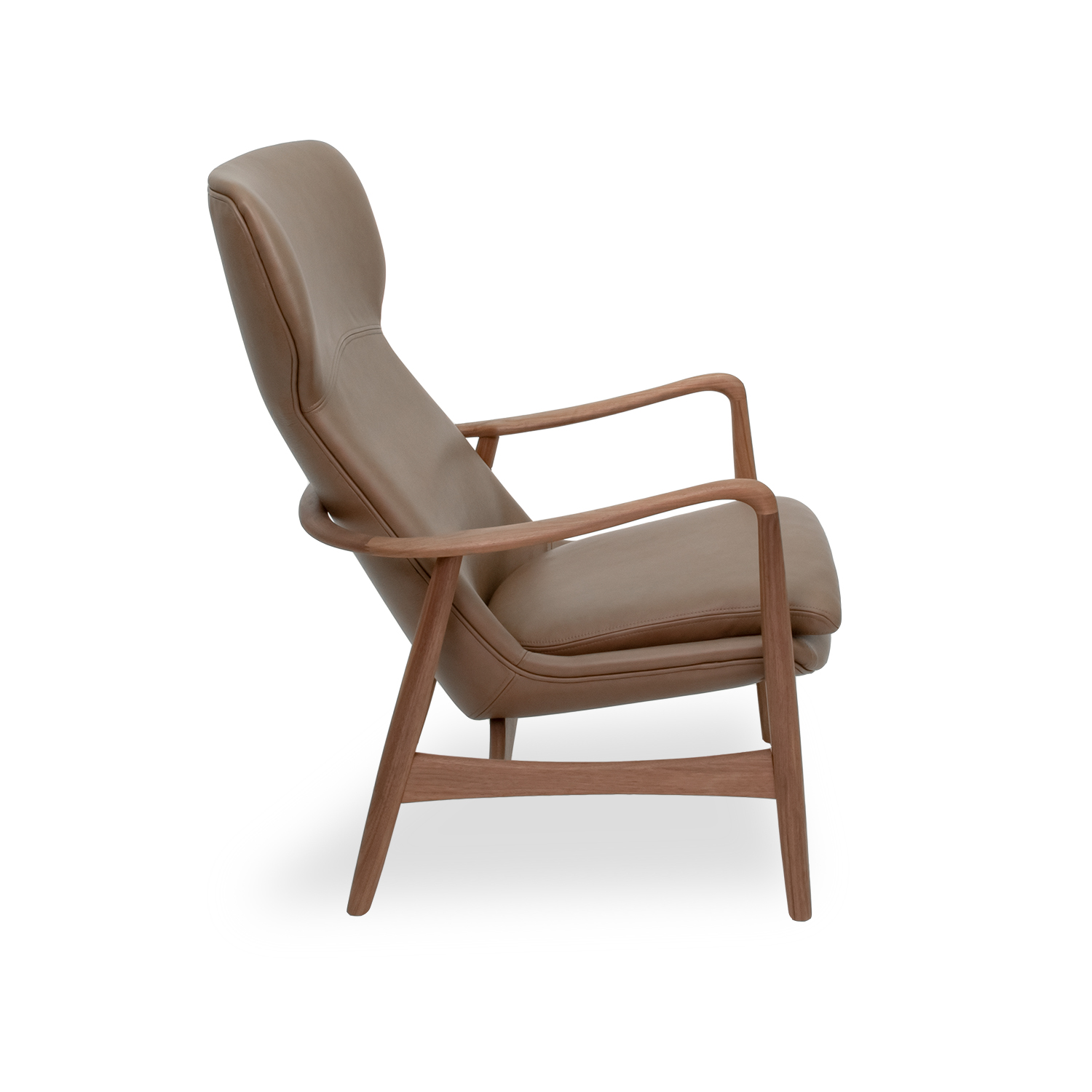 [0] => The Viking Chair, designed by Stig Christensen, has a timeless design and minimalist Scandinavian style. The smooth, curved frame is made from oiled walnut wood, and perfectly complements the wide, rounded headrest and seat. Viking features taupe Sevilla leather, a soft, slightly buffed semi-aniline leather with a natural grain.