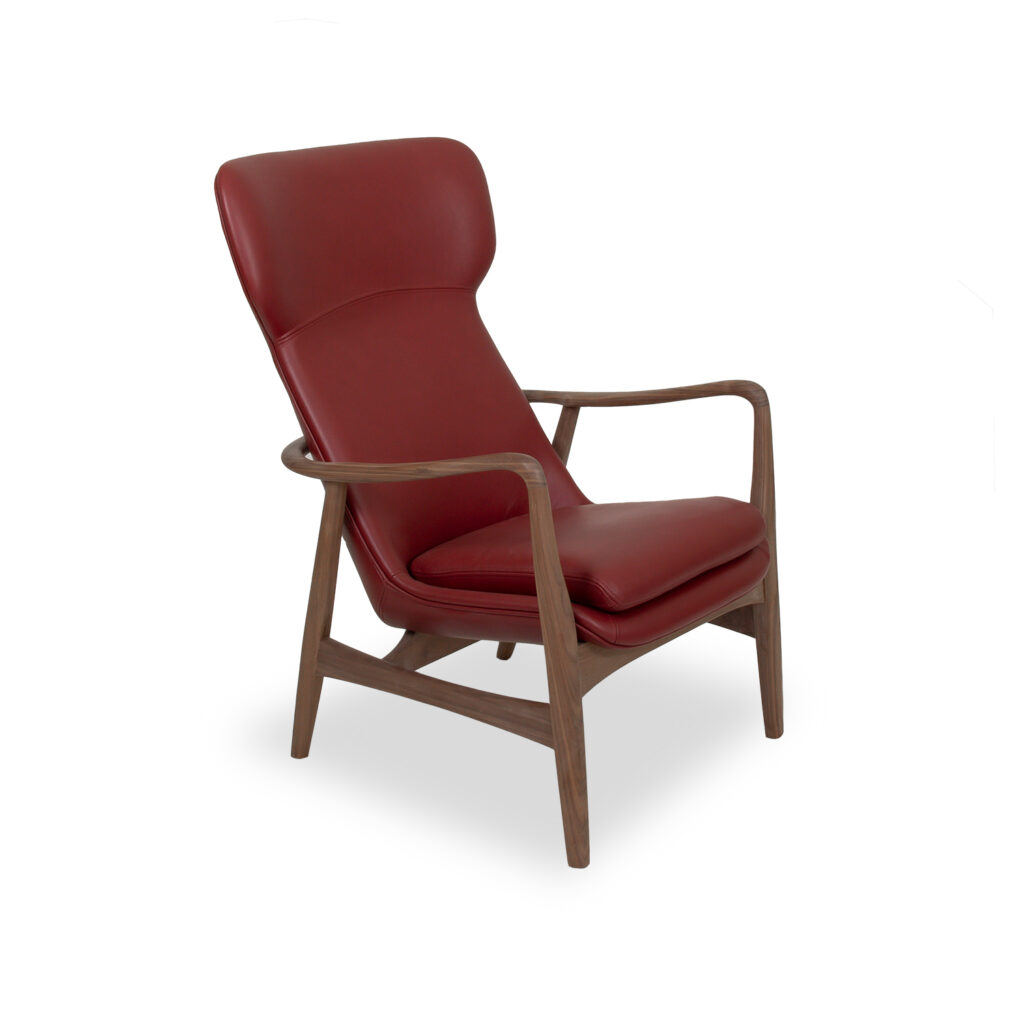 The Viking Chair, designed by Stig Christensen, has a timeless design and minimalist Scandinavian style. The smooth, curved frame is made from oiled walnut wood, and perfectly complements the wide, rounded headrest and seat. Viking features kelato chilli Sevilla leather, a soft, slightly buffed semi-aniline leather with a natural grain.