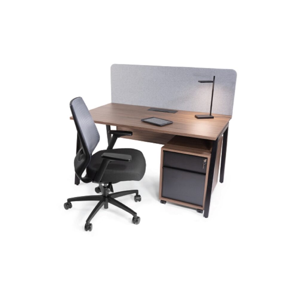 [0] => vili desk 55 x 31.5 x 29h with black metal base, dark walnut melamine d4 table top and modesty panel dnh140 with black painted rectangular metal grommet znz010 and cable tray dnz020. knocked down. dna141