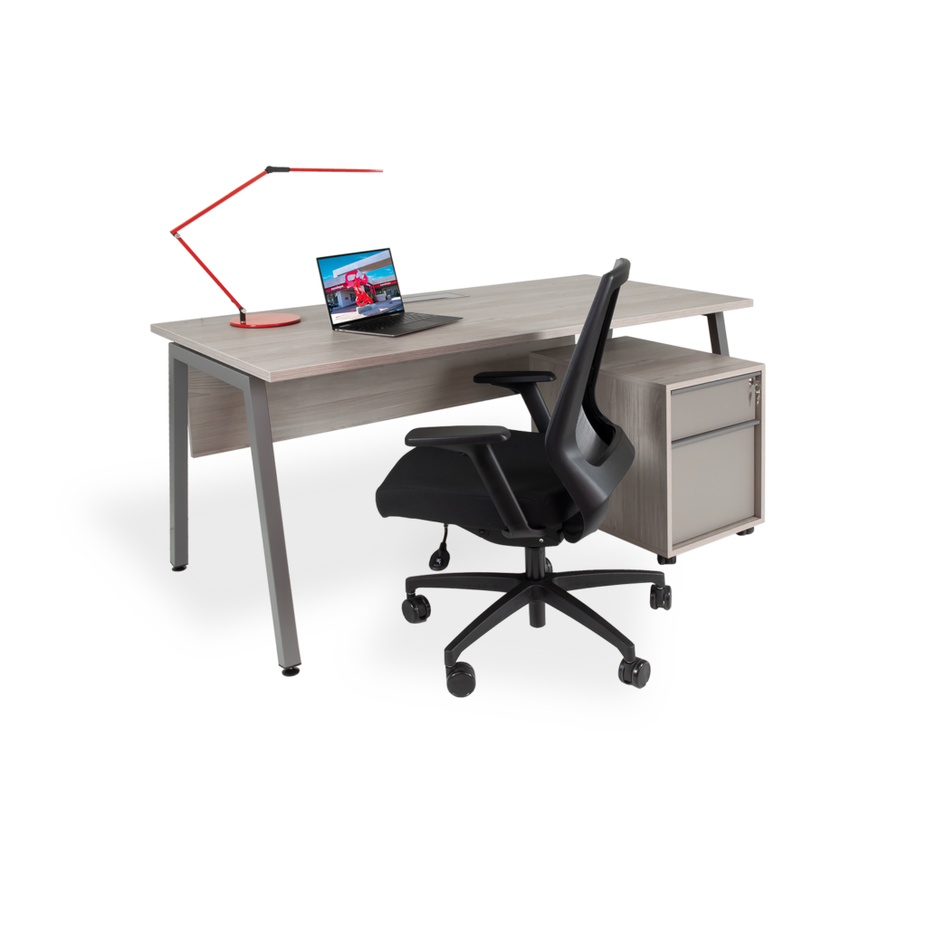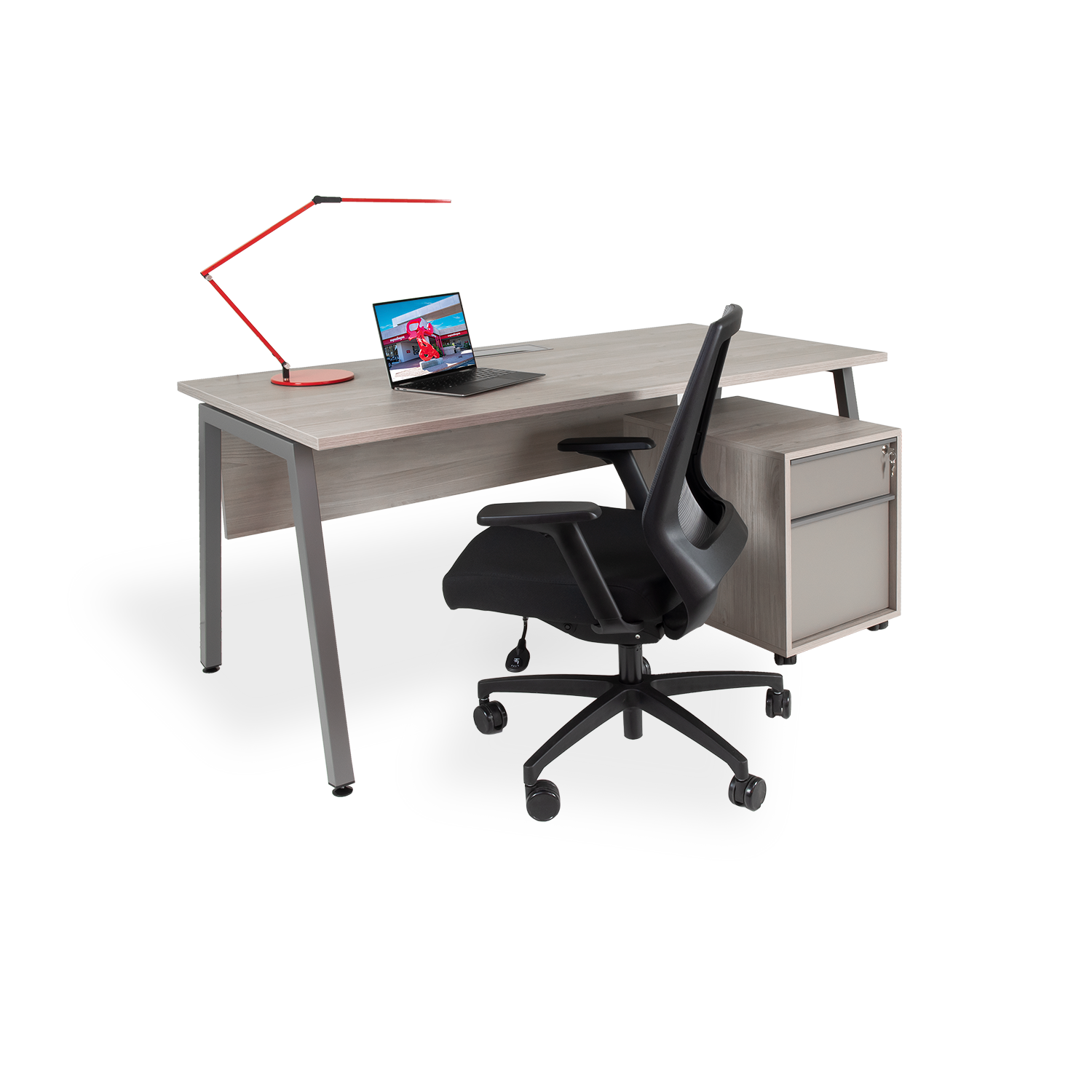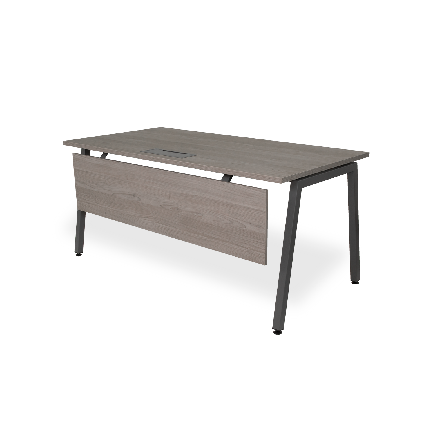 [0] => The Vili desk creates a spacious, functional, and stylish workspace for your corporate or home office. Vili's desktop and modesty panel are made from grey wood melamine with a rich hue and high quality finish. What's more, Vili has a built-in wire management system and cable tray, concealed by a black-painted metal plate. Minimalist in design, the angled front legs of the desk and clean, linear silhouette add subtle style and flair.