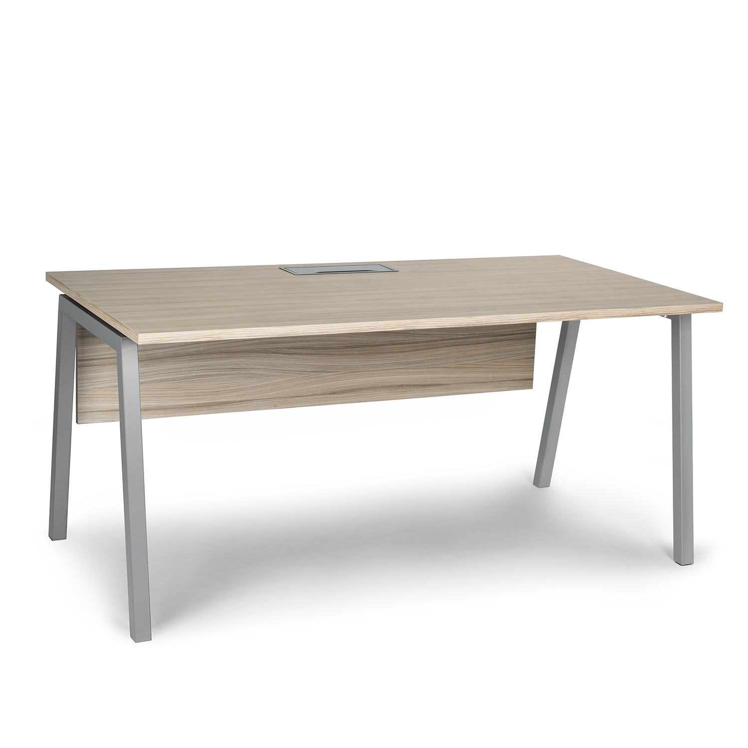 [0] => The Vili desk creates a spacious, functional, and stylish workspace for your corporate or home office. Vili's desktop and modesty panel are made from grey shorewood melamine with a subtle hue and high quality finish. What's more, Vili has a built-in wire management system and cable tray, concealed by a grey-painted metal plate. Minimalist in design, the angled front legs of the desk and clean, linear silhouette add subtle style and flair.