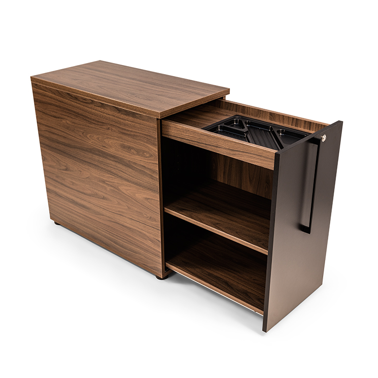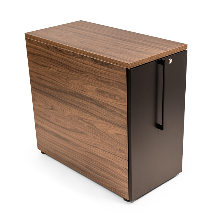 [0] => The Vili high cabinet, available in dark walnut melamine with black melamine drawer fronts and metal pulls, complements any of the desks from the Vili collection. The unit has one pull-out drawer and two spacious cabinet compartments. Its high design enables it to accommodate more storage. The lock and key ensure that your files and valuables stay secure, and the pull-out drawer has a built-in organizer.