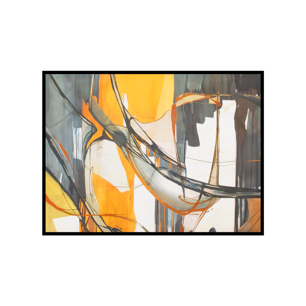 The Virtues I Painting is inviting and bright, with vivid yellow, deep orange, and warm-toned grey and white blending together in abstract shapes. The gentle curves bring a sense of leisurely peacefulness, while the warm tones will enhance any space. The Virtues I Painting has a black frame.