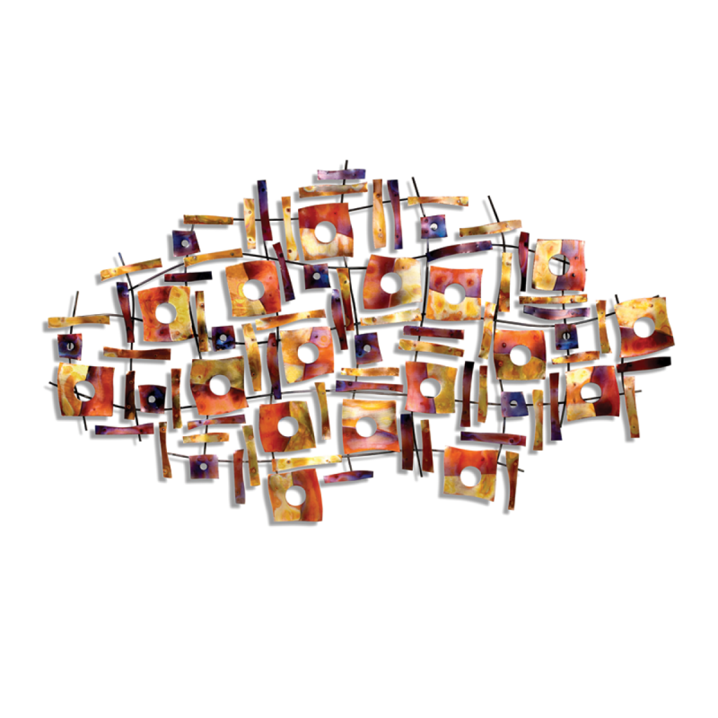 [0] => The Vivacious Wall Art features a variety of geometric shapes, rendered in tinted flame-treated copper and connected together to create a contemporary piece of art. Shades of red, yellow, and purple lend the metal a vibrant, colorful look that will add a dynamic, three-dimensional element to your living or office space.
