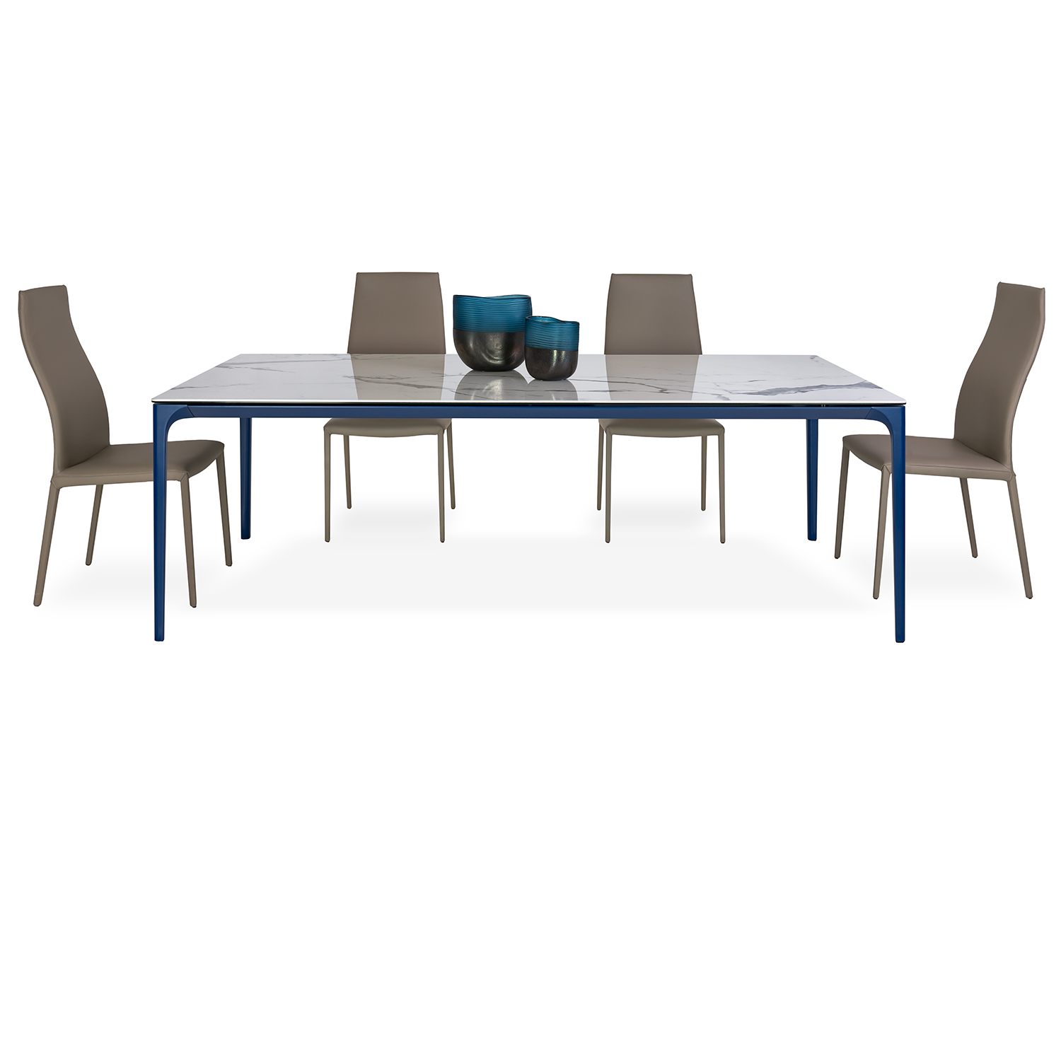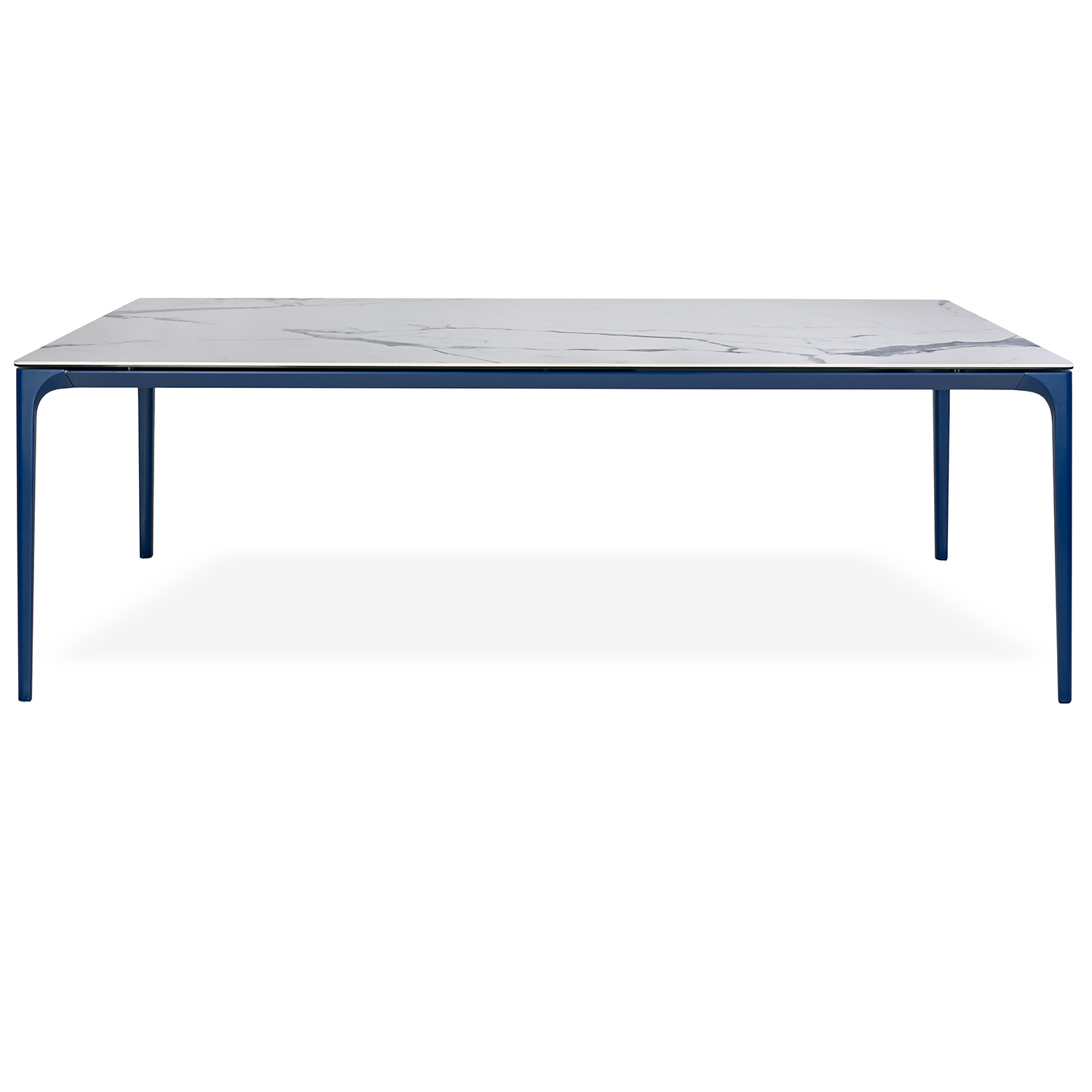 [0] => volta extension table 87 in x 43 in extends to 114 in, glossy estatuario porcelain top with metal base in matt saphphire blue ral5003