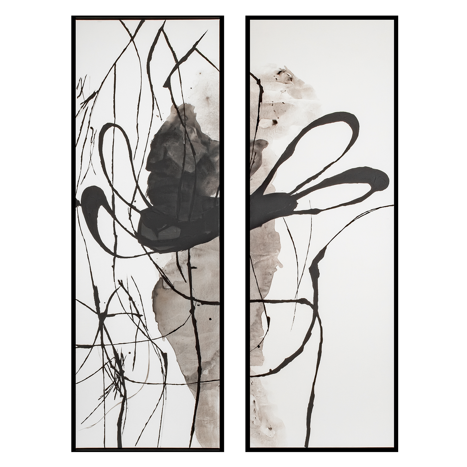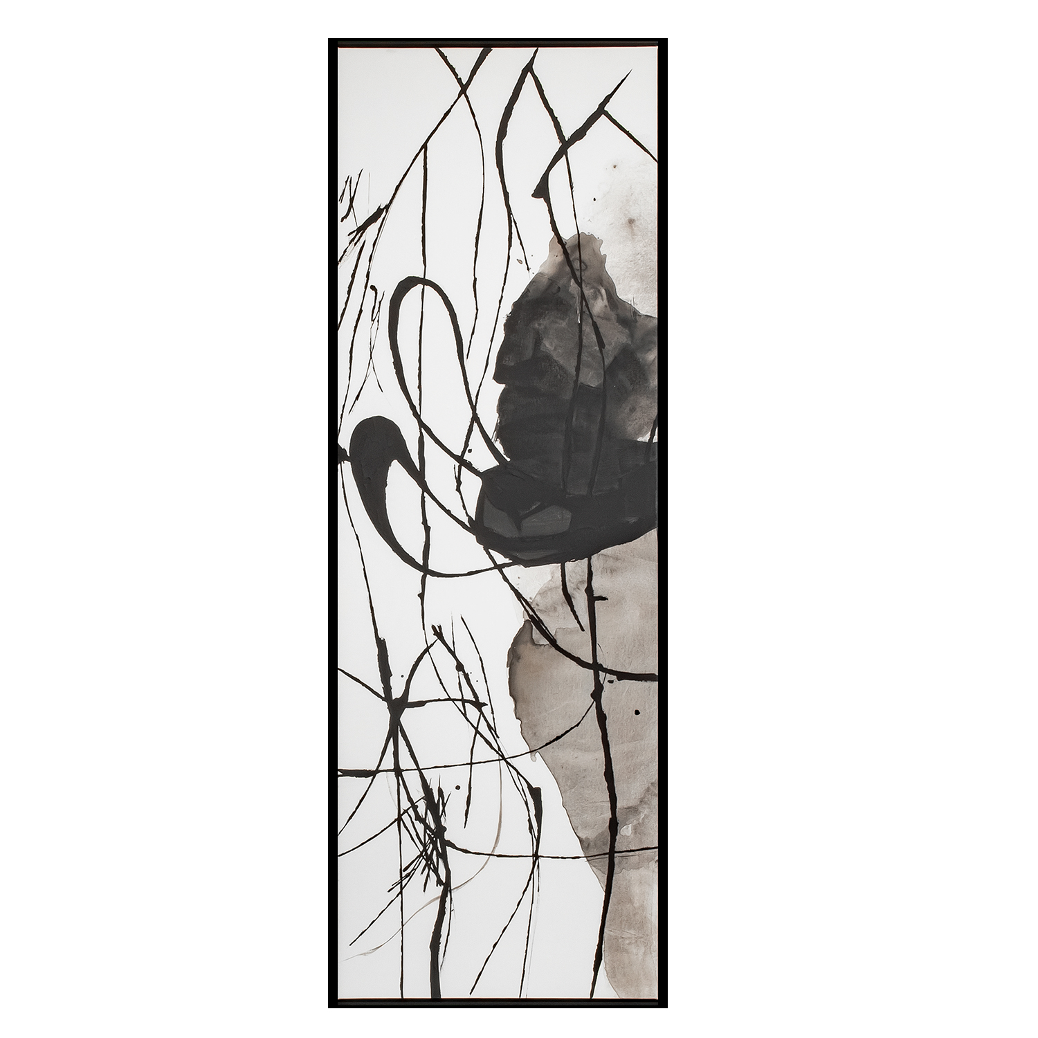 [0] => Waking Up III is an abstract painting that's minimalist yet powerful. Black paint dances over the canvas in freeform loops and lines while a wash of grey in the bottom right provides a gradation of hue. With its extra-large size and black frame, Waking Up III will provide a bold yet graceful presence to any contemporary interior, either alone or paired with the Waking Up IV companion painting.
