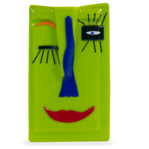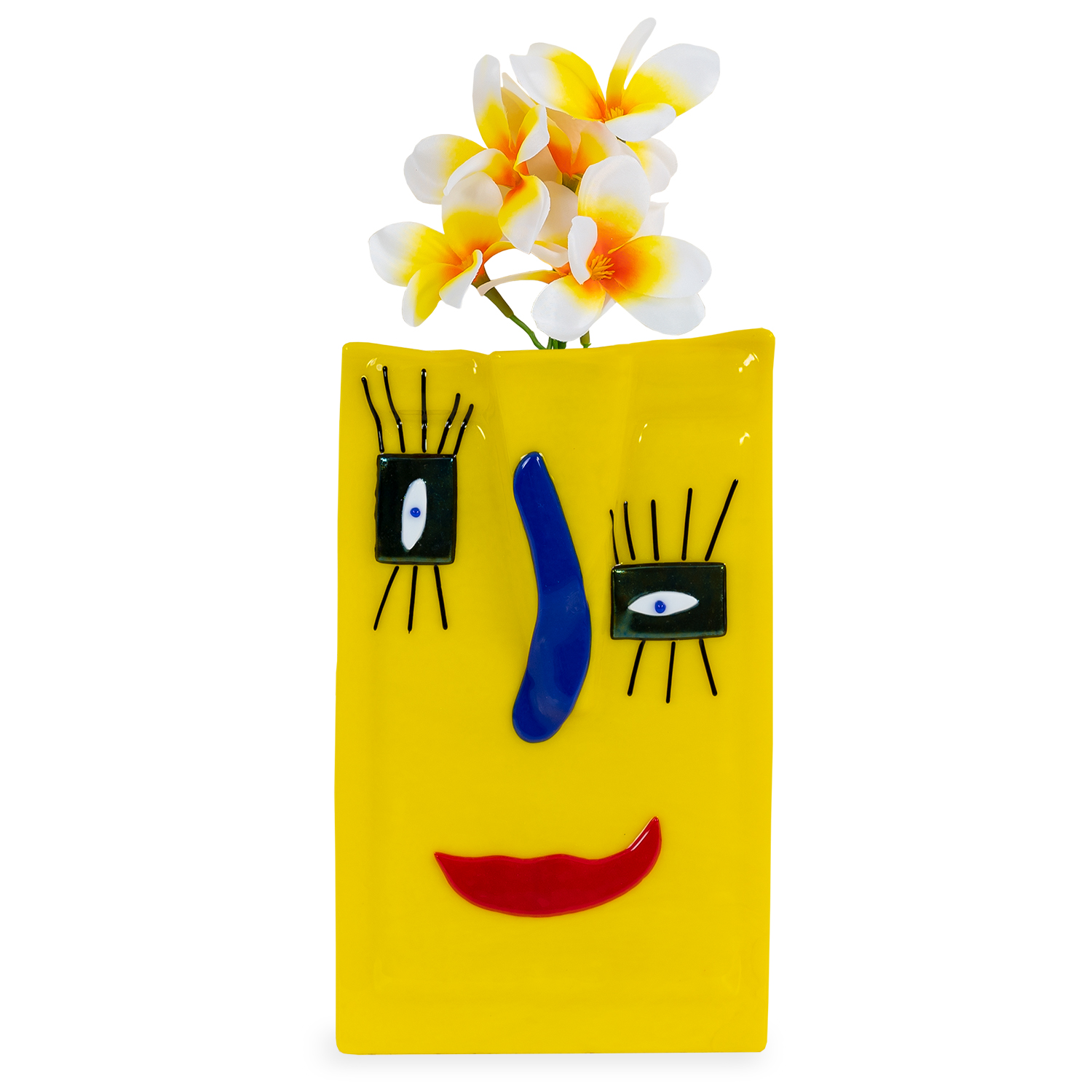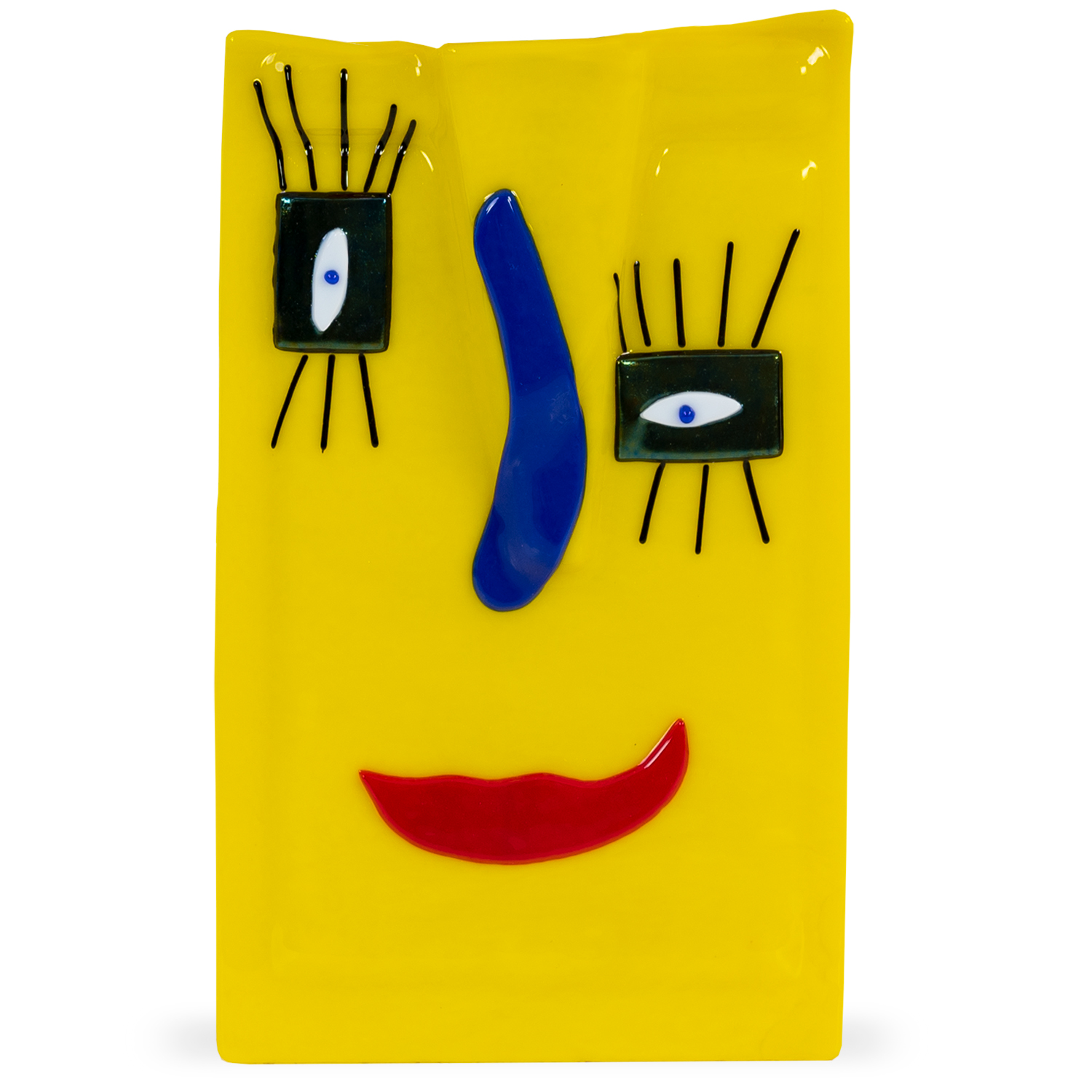 Whimsical and full of personality, the Wallflower Glass Face Vase functions both as a wall sculpture and a hanging vase. Made by Arizona glass artisans Carole Perry and Don Carroll, Wallflower features a playful asymmetrical expression, a hollow "nose" perfect for a pint-sized bouquet, and a bright shade of canary yellow that will jazz up any wall.