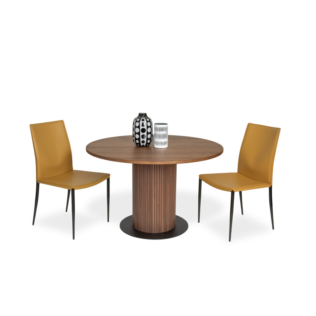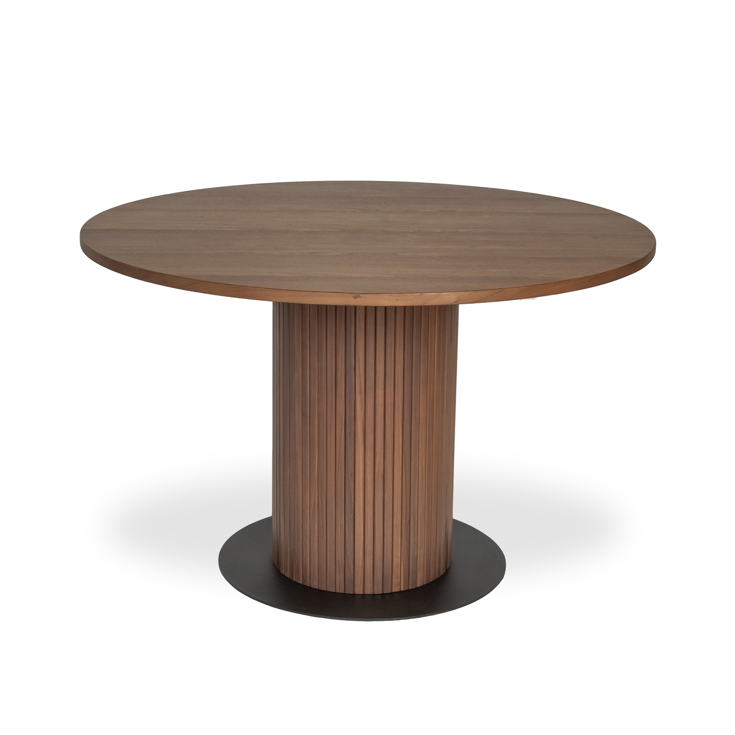 [0] => The Wave Round Dining Table melds Scandinavian design with a mid-century modern look. The inviting circular tabletop can seat 4 to 6 diners, while the slatted detailing on the cylindrical base is sure to catch the eye. A black metal disk under the cylinder provides a contrasting accent. This table is made of wood with a walnut veneer, sourced from responsibly managed forests. Dine in sustainable style with Wave.