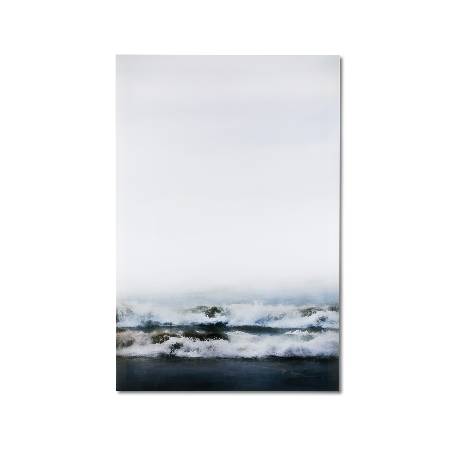 The Waves Wall Art brings the ocean to you. Available in a gloss finish, this photograph captures the coolness of a cloudy, grey day by the seaside and the churning sound of incoming waves. The juxtaposition of the hazy white backdrop with the dark grey sand creates a contrast that is both calming and dynamic.