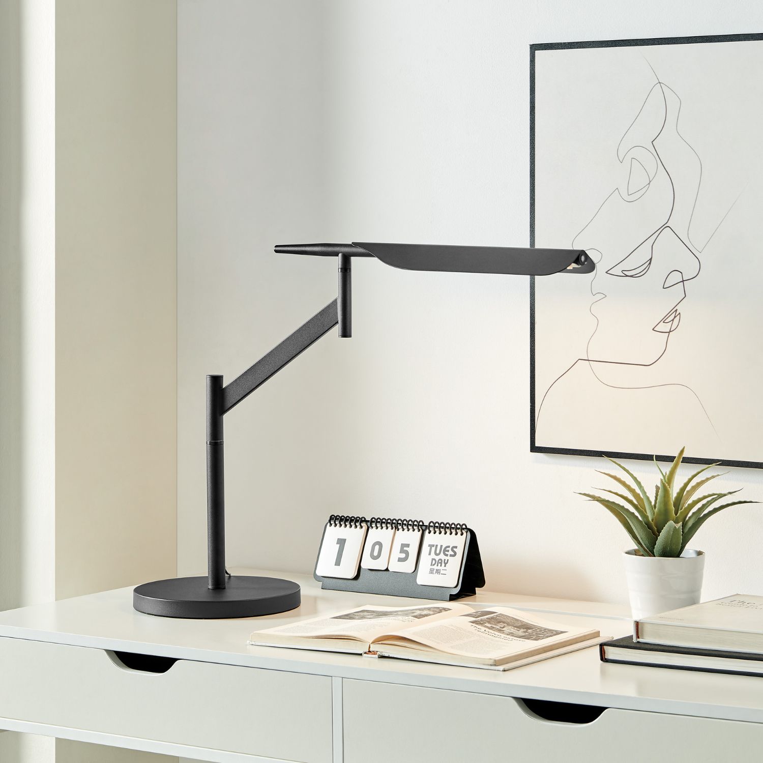 The Wheaton Table Lamp blends curved and angular elements for a striking, industrial-inspired design. Wheaton's black metal frame has an elongated, peaked lampshade housing an LED light that offers focused illumination. Two rotating arms and a tiltable shade let you find the angle of light that's right for you. Touch the sensor at the end of the lampshade to turn Wheaton on or off, or to switch between cool, neutral, and warm color temperatures.