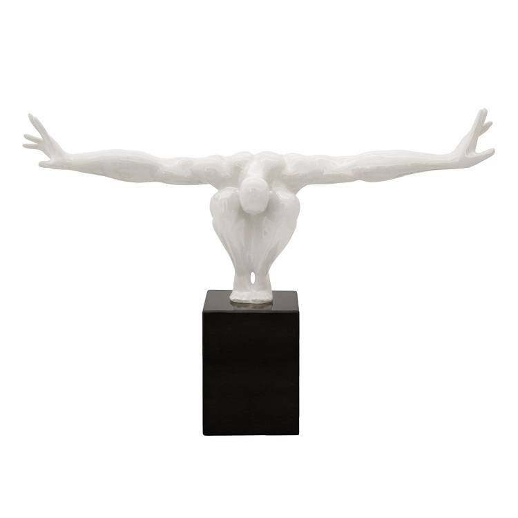 The White Baron Sculpture depicts a crouched figure with their arms extended out to the side, evoking boldness, power, and vulnerability all at once. The sculpture's muscled form brings a sense of strength and dynamic motion to your space, while the black stone base lets it easily sit on any display surface.