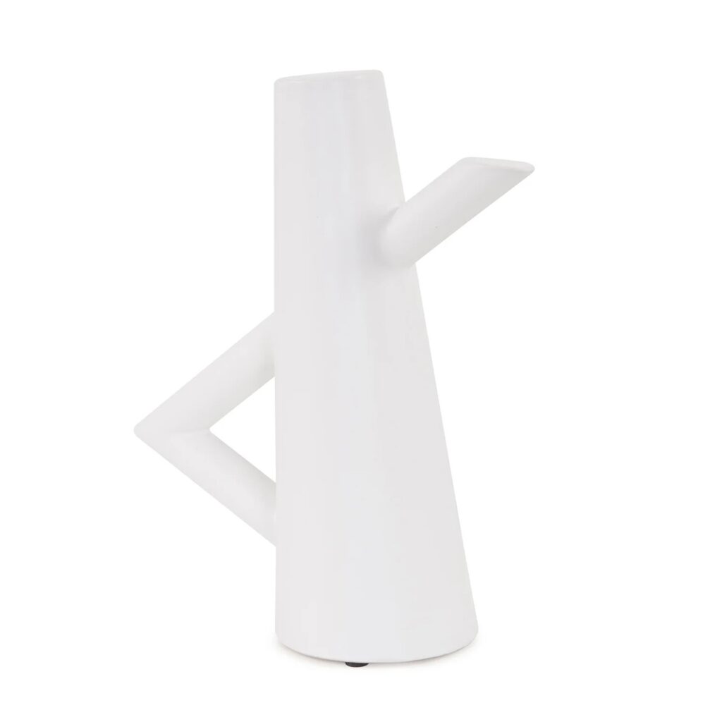 Inspired by Scandinavian design, the White Ceramic Vase I is both minimalist and utterly unique. What would otherwise be a simple tapered vase receives a dramatic twist in the form of an angular element that appears to cut through its center. Fill with flowers or display with other vases in the same collection for an audaciously modern accent.