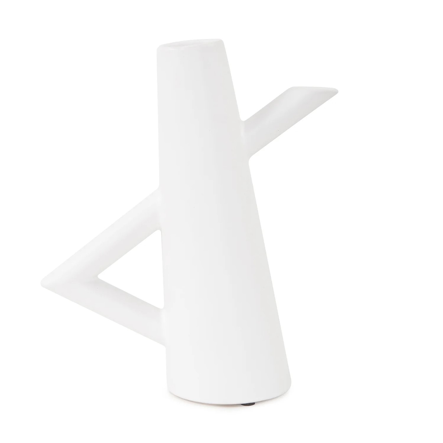 [0] => Inspired by Scandinavian design, the White Ceramic Vase I is both minimalist and utterly unique. What would otherwise be a simple tapered vase receives a dramatic twist in the form of an angular element that appears to cut through its center. Fill with flowers or display with other vases in the same collection for an audaciously modern accent.