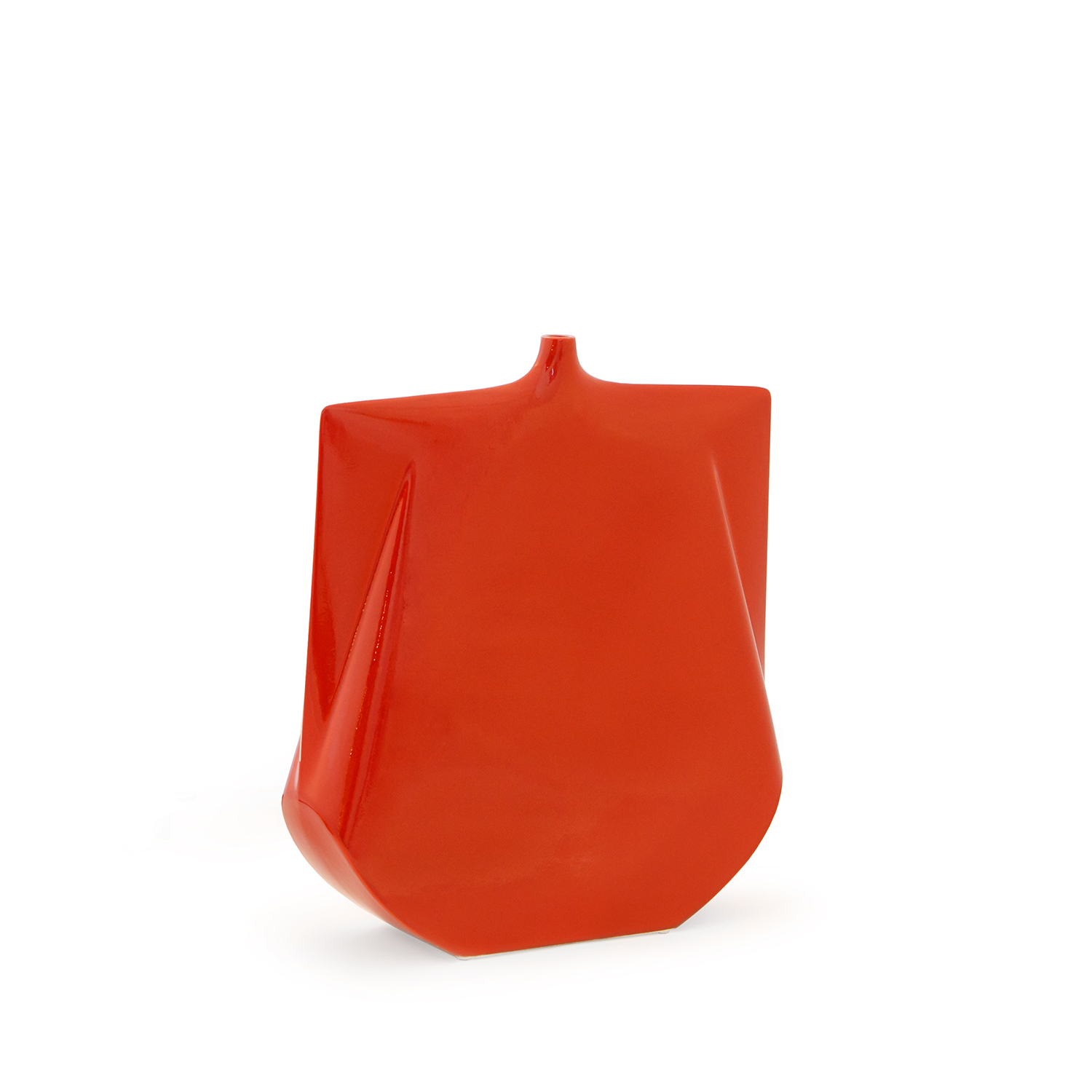 The Wide Kimono Vase is a Portuguese ceramic piece with deep tomato red reactive glaze. Bold and unique, this vase was inspired by the shape of the Japanese kimono, and is the perfect cultural art piece for any living or office space.