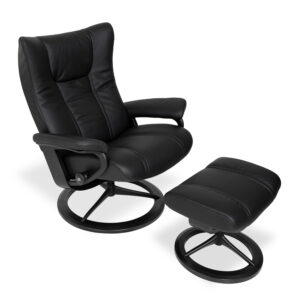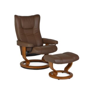 The Wing chair and ottoman by Ekornes of Norway is one of the first and most popular Stressless® designs dating back to 1994. The chair's design is timeless, though its innerworkings feature cutting edge Stressless® comfort technology, including the patented Plus™ and Glide systems, which allow the chair to provide continuous support for the head and lower back, while also adjusting the reclining angle based on shifts of the body. Available with a classic teak base and chestnut Paloma leather upholstery, this piece has a smoothly curved "winged" headrest and matching stitching that creates crisp lines in the leather.