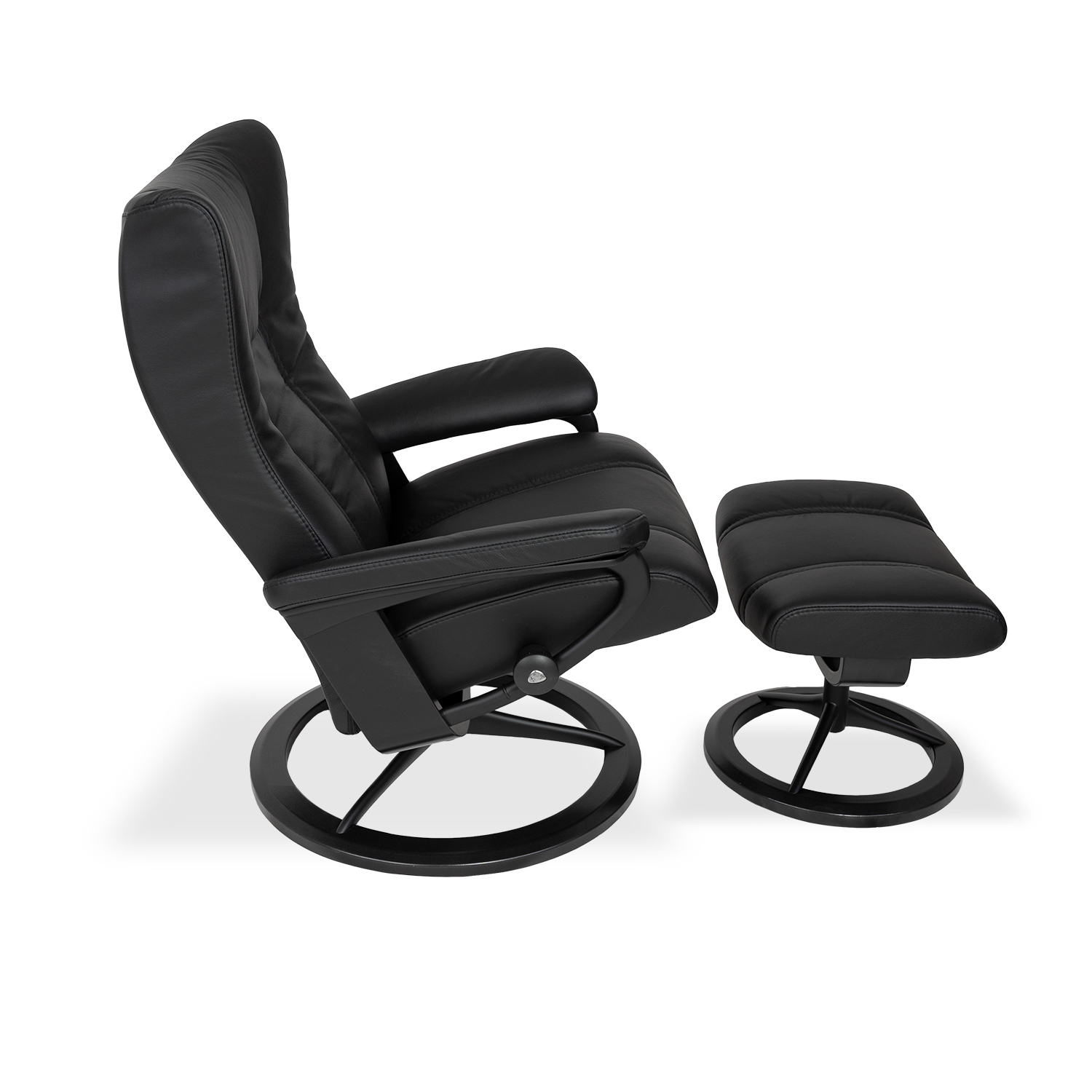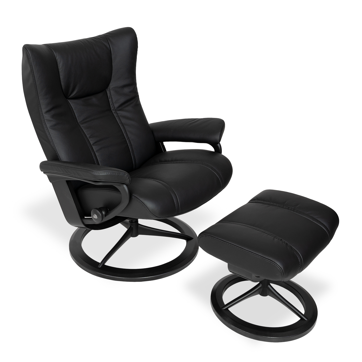 The Wing chair and ottoman by Ekornes of Norway is one of the first and most popular Stressless® models, debuting in 1994. Though the design is timeless, the chair features cutting-edge comfort technology, including the Plus™ and Glide systems that continuously support your head and lower back, while adjusting the reclining angle based on shifts in your position. The chair's Signature base is built with Stressless® BalanceAdapt™, giving it a gentle rocking motion that moves with your body. Available in Large with black Paloma leather upholstery and a matching black metal base, this chair has an iconic "winged" headrest and clean stitching that creates crisp lines in the leather.