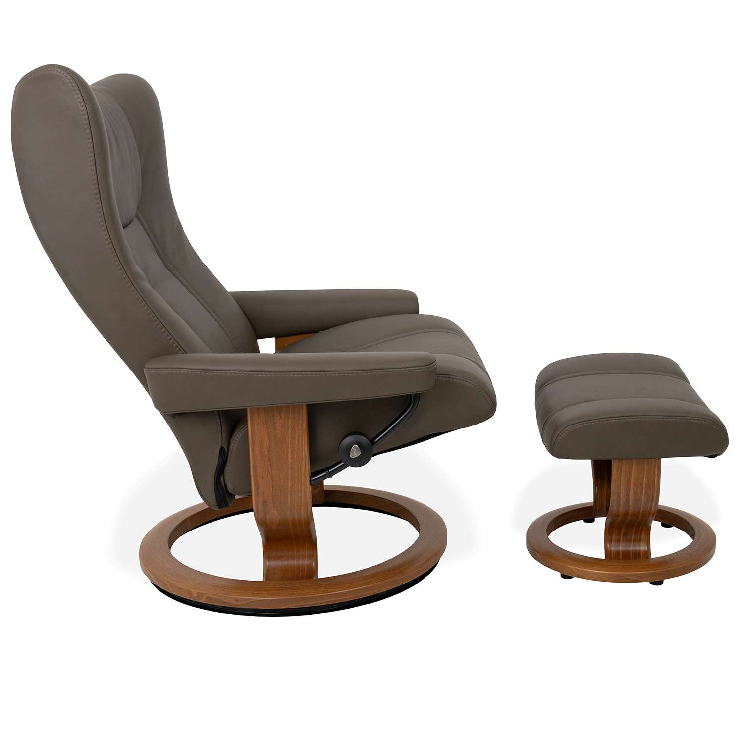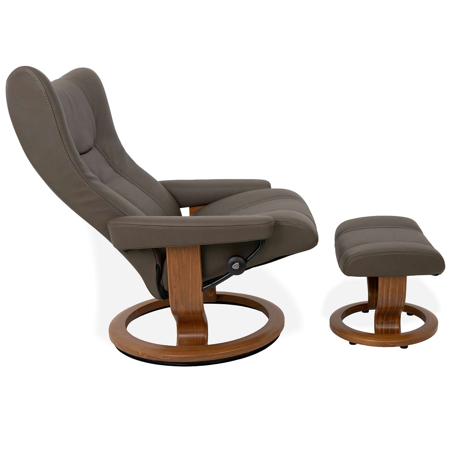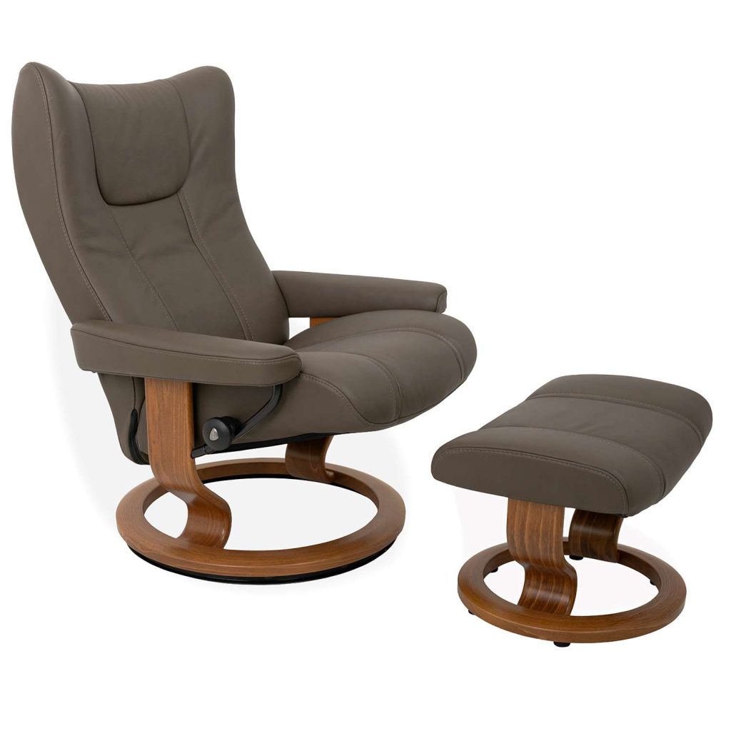 The Wing Large Chair and Ottoman by Ekornes of Norway is one of the first and most popular Stressless® designs, dating back to 1994. Available with a teak Classic base and Velaro leather upholstery in a dark and earthy forest green, this chair has a smoothly curving "winged" headrest and matching stitching that creates crisp lines in the leather. Wing's timeless design is paired with cutting-edge Stressless® comfort technology within the chair, including the patented Plus™ and Glide systems. These ergonomic mechanisms allow the chair to provide continuous support for the head and lower back, while also adjusting the reclining angle based on shifts of the body.