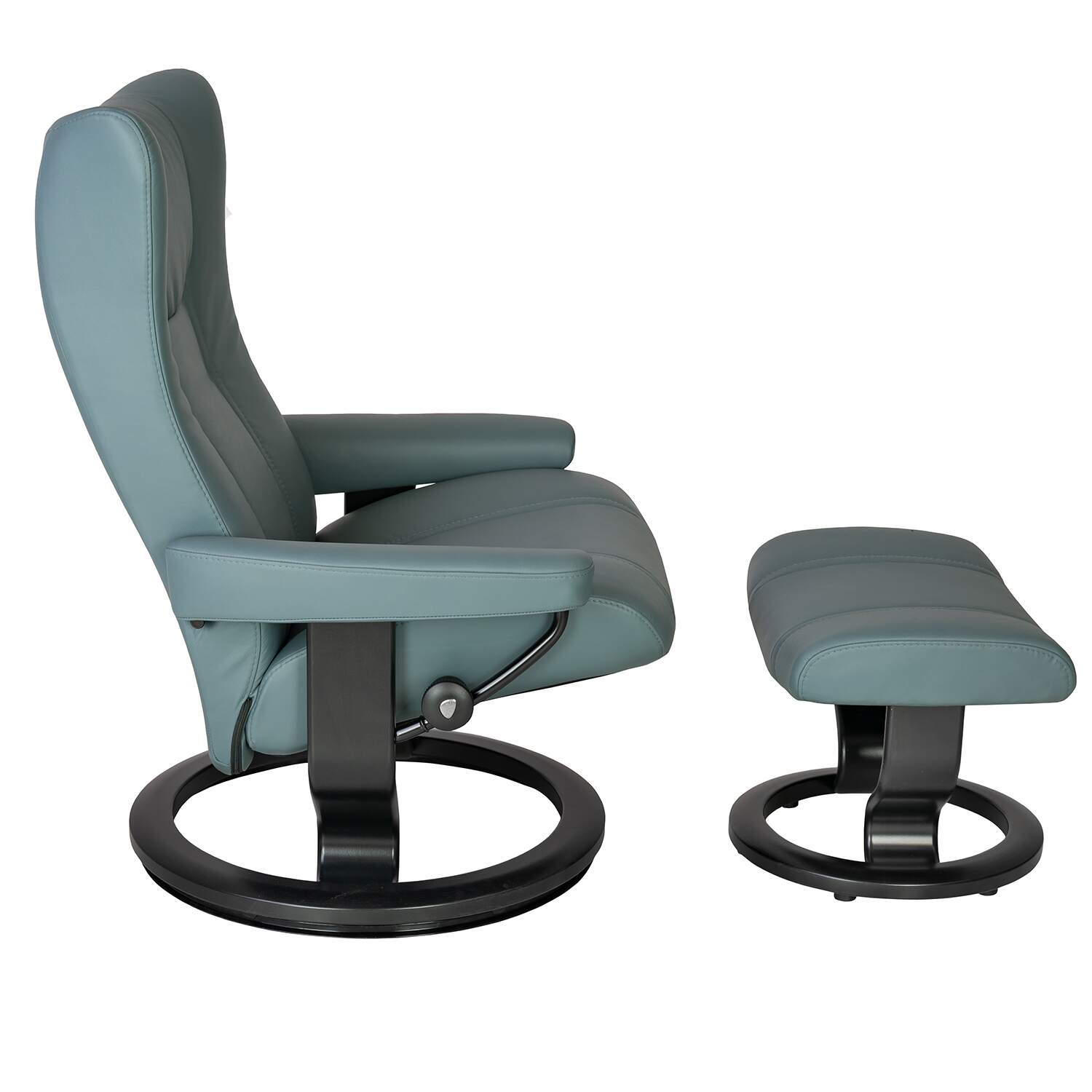 The Wing Medium Chair and Ottoman by Ekornes of Norway is one of the first and most popular Stressless® designs, dating back to 1994. Available with a black Classic base and teal blue Paloma leather upholstery, this chair has a smoothly curving "winged" headrest and matching stitching that creates crisp lines in the leather. Wing's timeless design is paired with cutting-edge Stressless® comfort technology within the chair, including the patented Plus™ and Glide systems. These ergonomic mechanisms allow the chair to provide continuous support for the head and lower back, while also adjusting the reclining angle based on shifts of the body.