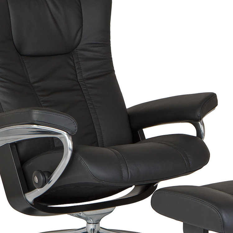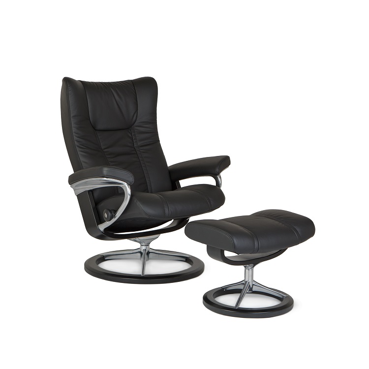 [0] => The Wing chair and ottoman by Ekornes of Norway is one of the first and most popular Stressless® designs dating back to 1994. The chair's design is timeless, though its innerworkings feature cutting edge Stressless® comfort technology, including the patented Plus™ and Glide systems, which allow the chair to provide continuous support for the head and lower back, while also adjusting the reclining angle based on shifts of the body. The chair's Signature base is equipped with Stressless® BalanceAdapt™, which which equips the chair with a light rocking motion based on changing positions of your body. Available with a Signature base with black accents and black Paloma leather upholstery, this piece has a smoothly curved "winged" headrest and matching stitching that creates crisp lines in the leather.