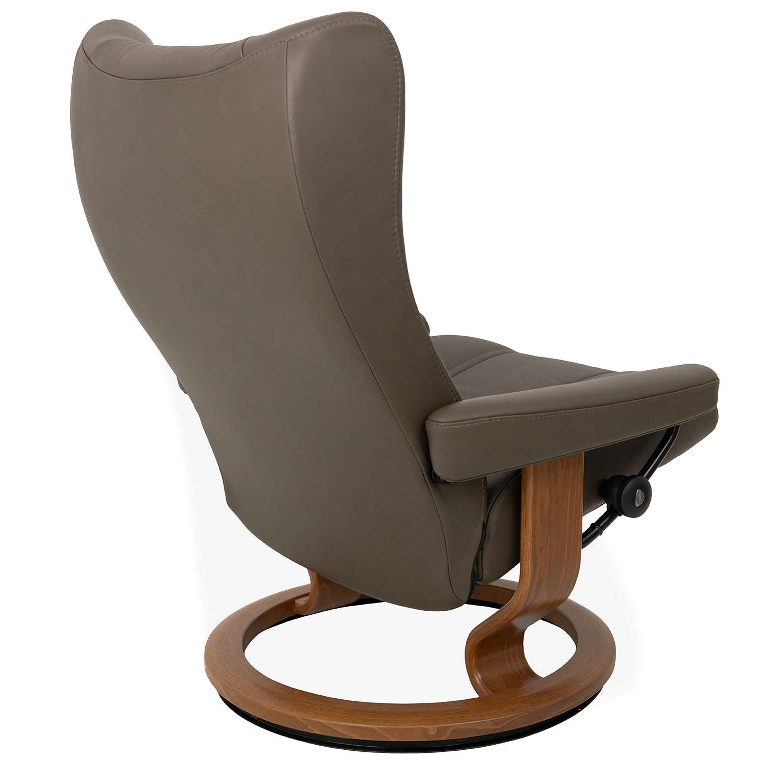The Wing Medium Chair and Ottoman by Ekornes of Norway is one of the first and most popular Stressless® designs, dating back to 1994. Available with a teak Classic base and Velaro leather upholstery in a dark and earthy forest green, this chair has a smoothly curving "winged" headrest and matching stitching that creates crisp lines in the leather. Wing's timeless design is paired with cutting-edge Stressless® comfort technology within the chair, including the patented Plus™ and Glide systems. These ergonomic mechanisms allow the chair to provide continuous support for the head and lower back, while also adjusting the reclining angle based on shifts of the body.