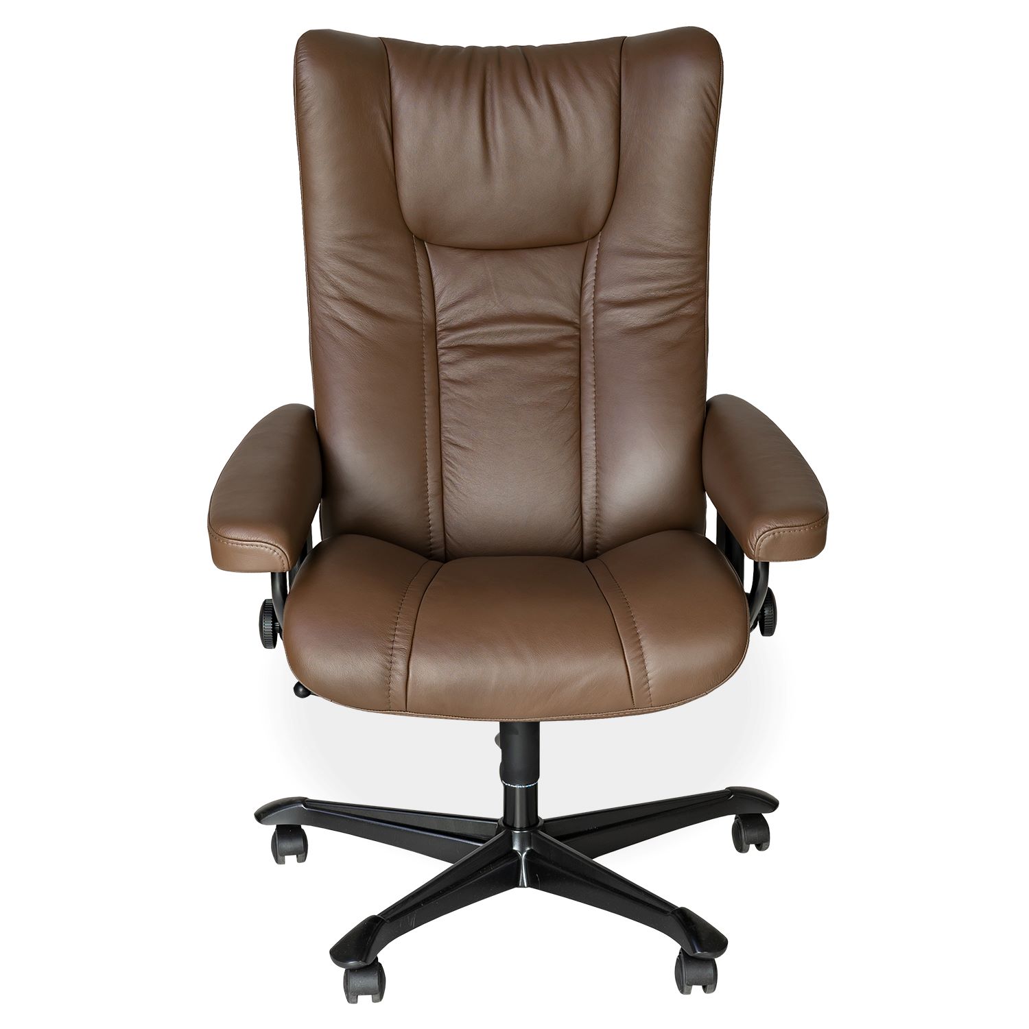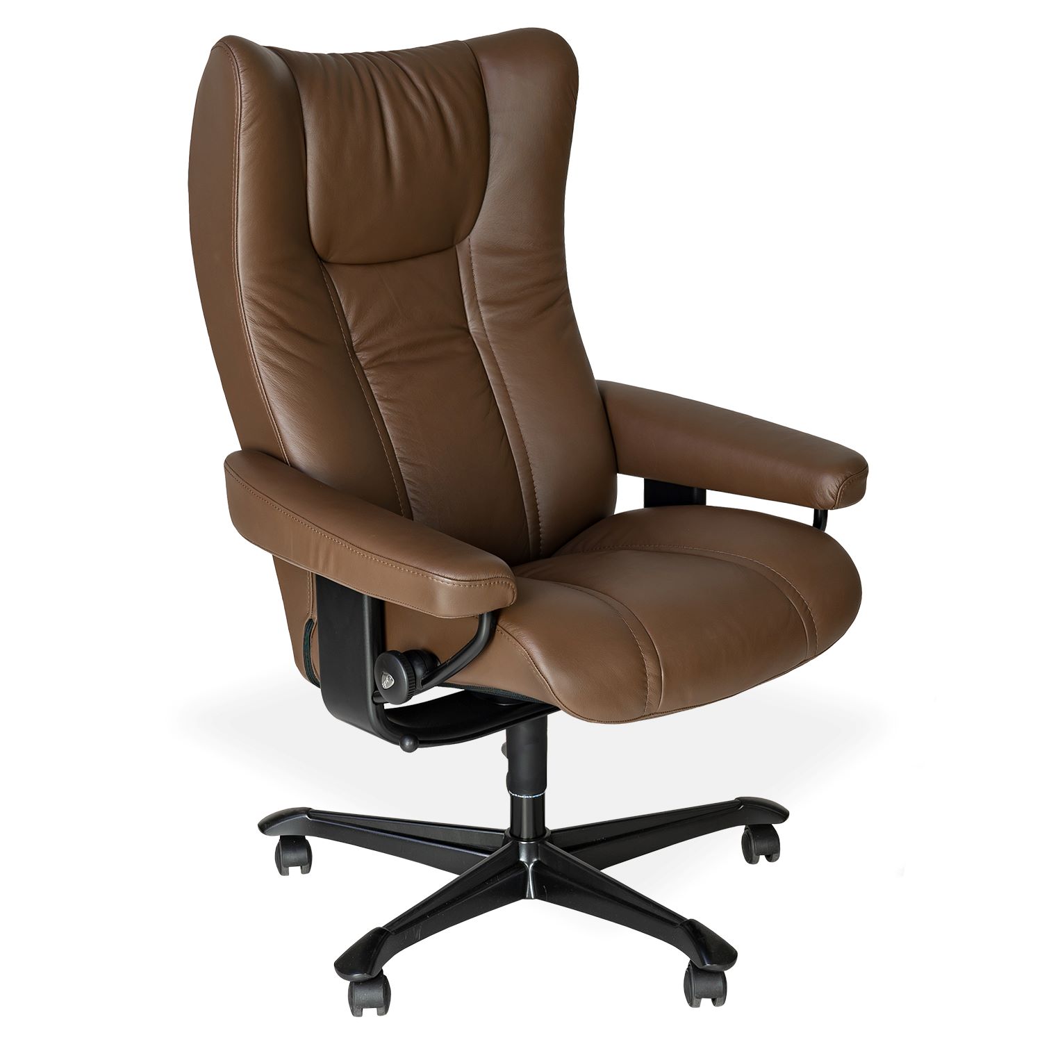 The Wing office chair brings classic Stressless® comfort to your workspace. The Wing chair is one of the first and most popular Stressless® designs dating back to 1994. The chair's design is timeless, though its innerworkings feature cutting edge Stressless® comfort technology, including the patented Plus™ and Glide systems, which allow the chair to provide continuous support for the head and lower back. Shown in Paloma Chestnut leather with a black frame, this piece has a smoothly curved "winged" headrest and matching stitching that creates crisp lines in the leather.