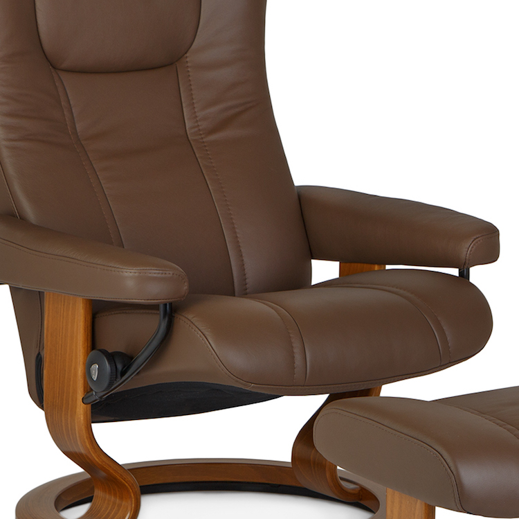 The Wing chair and ottoman by Ekornes of Norway is one of the first and most popular Stressless® designs dating back to 1994. The chair's design is timeless, though its innerworkings feature cutting edge Stressless® comfort technology, including the patented Plus™ and Glide systems, which allow the chair to provide continuous support for the head and lower back, while also adjusting the reclining angle based on shifts of the body. Available with a classic teak base and chesnut Paloma leather upholstery, this piece has a smoothly curved "winged" headrest and matching stitching that creates crisp lines in the leather.