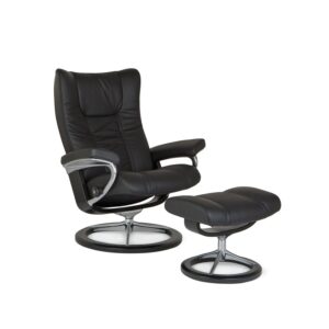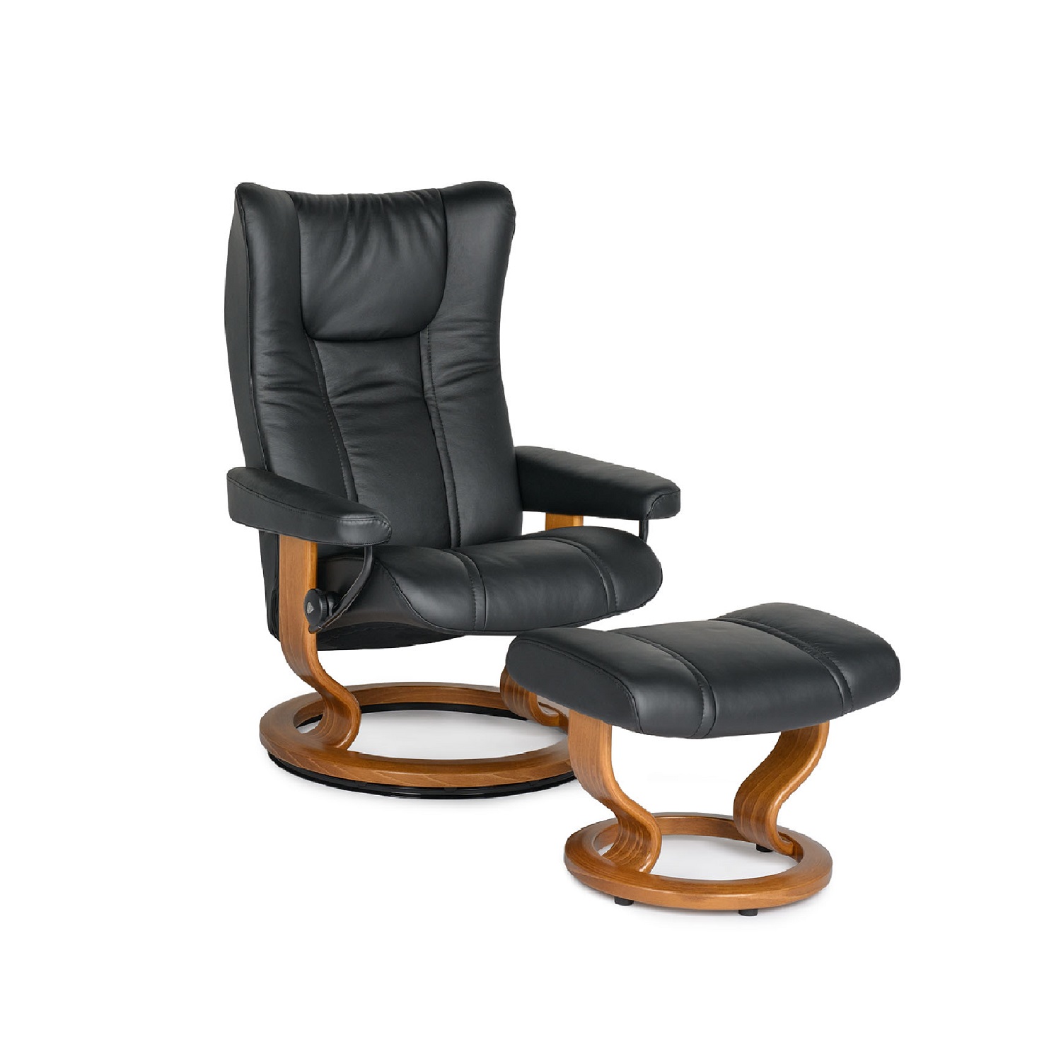 The Wing chair and ottoman by Ekornes of Norway is one of the first and most popular Stressless® designs dating back to 1994. The chair's design is timeless, though its innerworkings feature cutting edge Stressless® comfort technology, including the patented Plus™ and Glide systems, which allow the chair to provide continuous support for the head and lower back, while also adjusting the reclining angle based on shifts of the body. Available with a classic teak base and black Paloma leather upholstery, this piece has a smoothly curved "winged" headrest and matching stitching that creates crisp lines in the leather.
