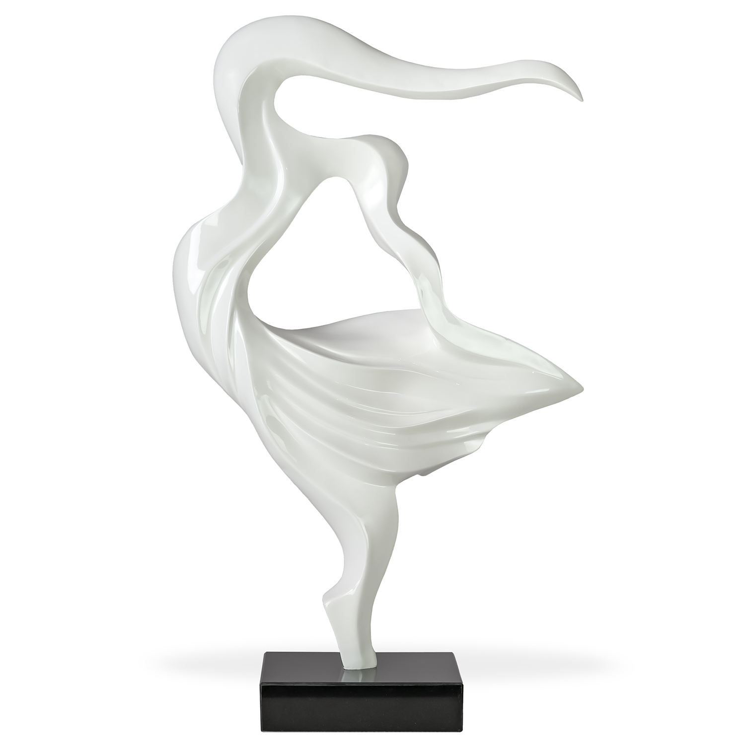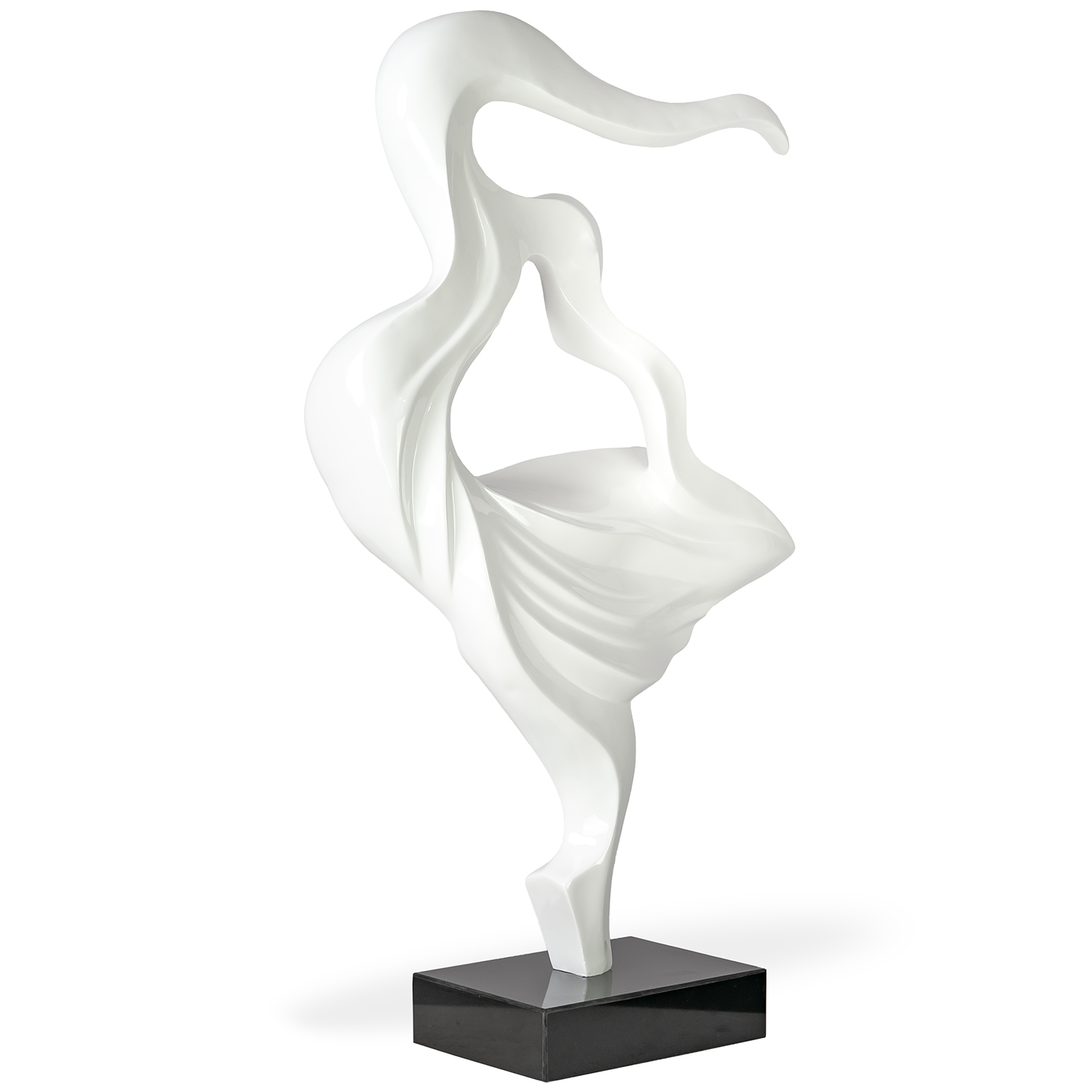 The Woman Sculpture is a flowing, abstract rendition of a feminine figure, crafted from white polyresin and mounted on a black stone base that makes it ready to display. This sculpture's curving lines and rippling folds evoke a woman with her hair and dress blown by the wind, creating a sense of lightness and dynamism.