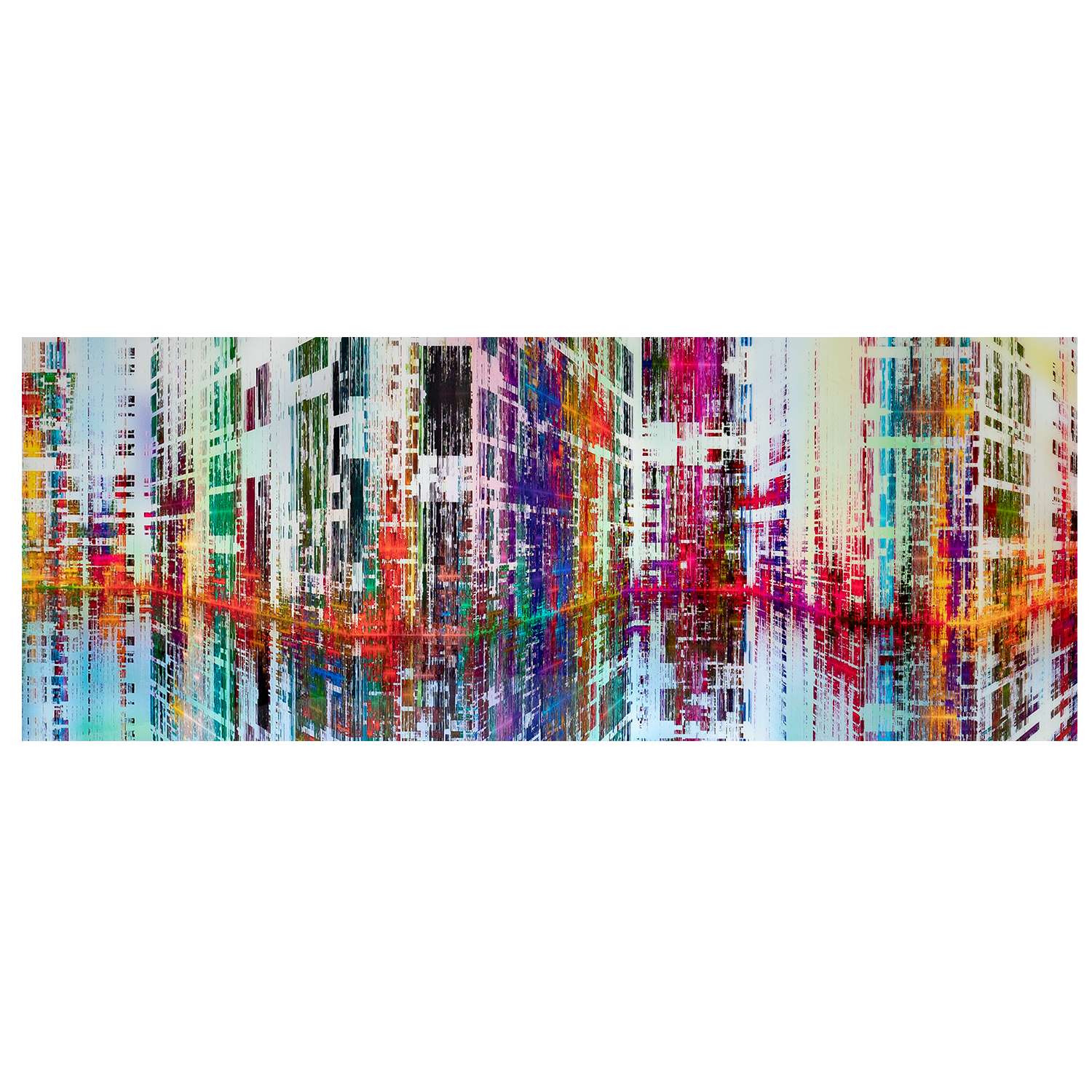 World City, by James Burghardt, is an edgy and dynamic abstract wall art that uses saturated colors to evoke an urban landscape. Linear formations in every shade from magenta to green to purple suggest tall buildings, and are printed with a blurred, distressed effect that creates a sense of movement. Available with a glossy finish, this artwork will bring the excitement of the city to any interior.