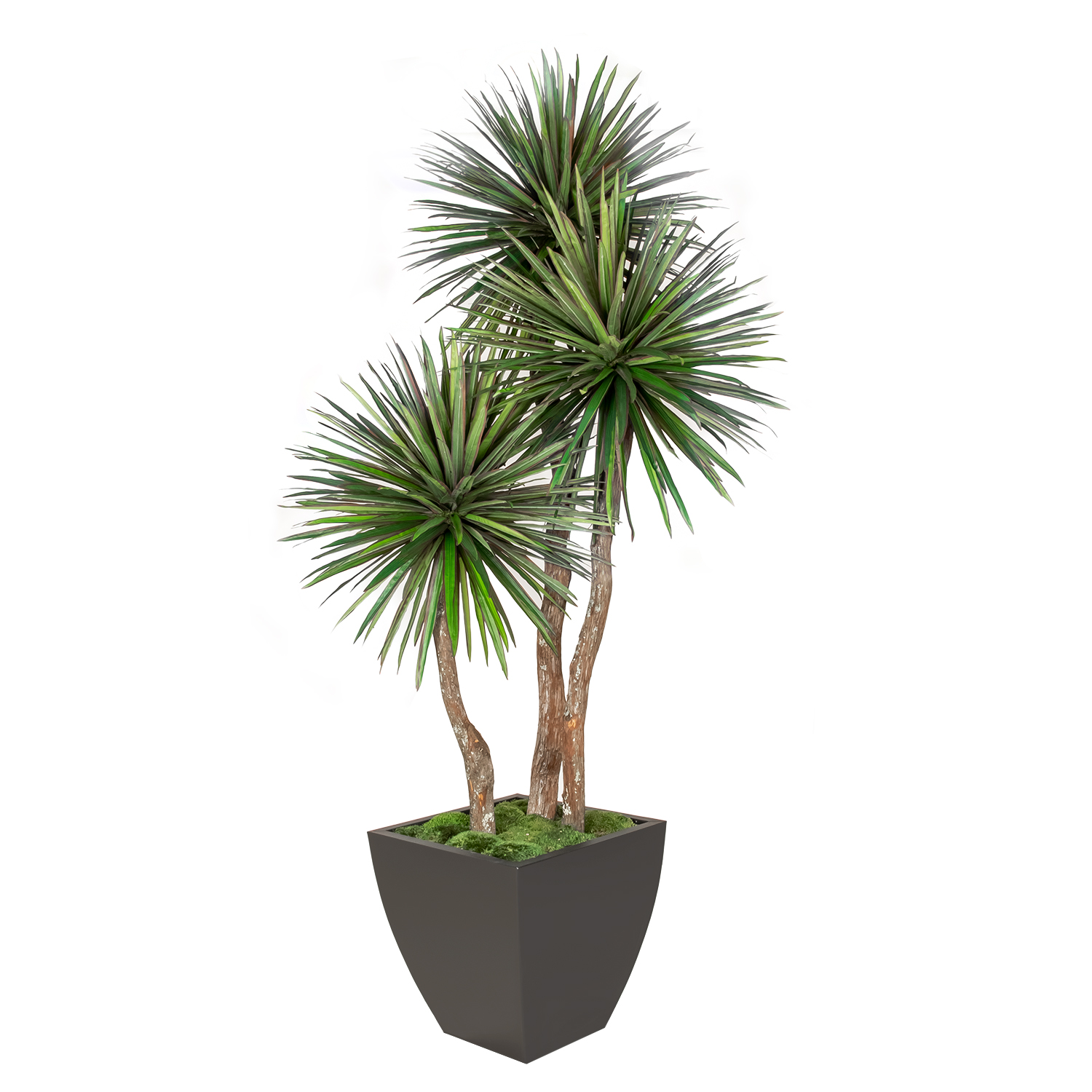 [0] => The Yucca Plant, which has three heads and comes in a black planter with decorative moss, is an attractive artificial plant for your living room, dining room, or office that brings bright green to your space -- all without needing to be watered!