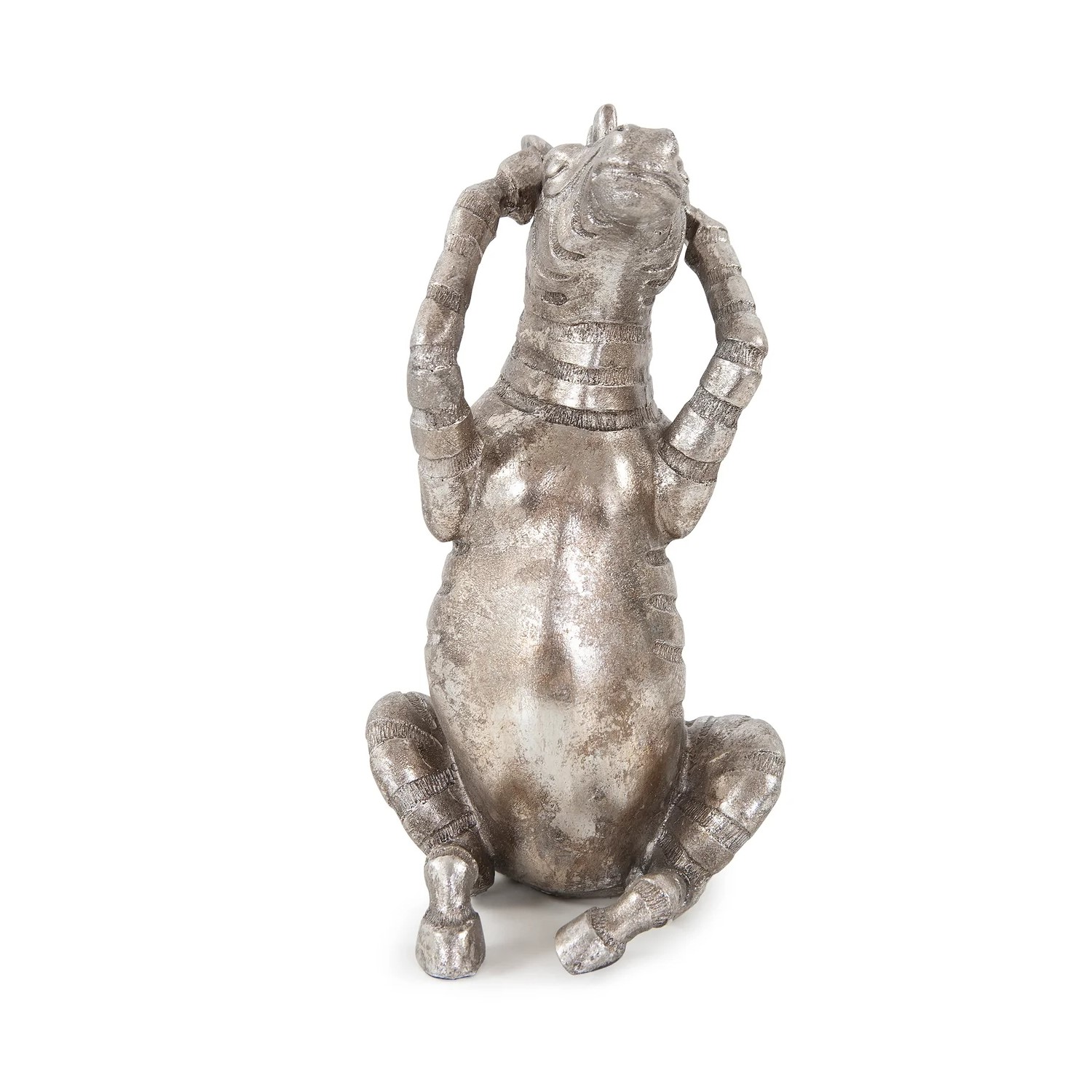 The Zebra Sculpture II sits on its haunches with its hooves covering its ears in the classic "hear no evil" pose. This sculpture is crafted of polyresin with an antique silver finish, featuring intricately carved stripes and an overall mood of humor and whimsy. Display Zebra II on its own or with its "see no evil" and "speak no evil" companions to complete your set.