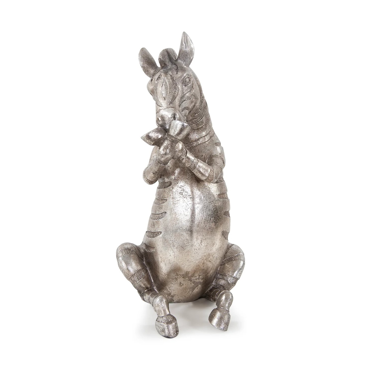 The Zebra Sculpture III sits on its haunches with its hooves covering its mouth in the classic "speak no evil" pose. This sculpture is crafted of polyresin with an antique silver finish, featuring intricately carved stripes and an overall mood of humor and whimsy. Display Zebra III on its own or with its "see no evil" and "hear no evil" companions to complete your set.