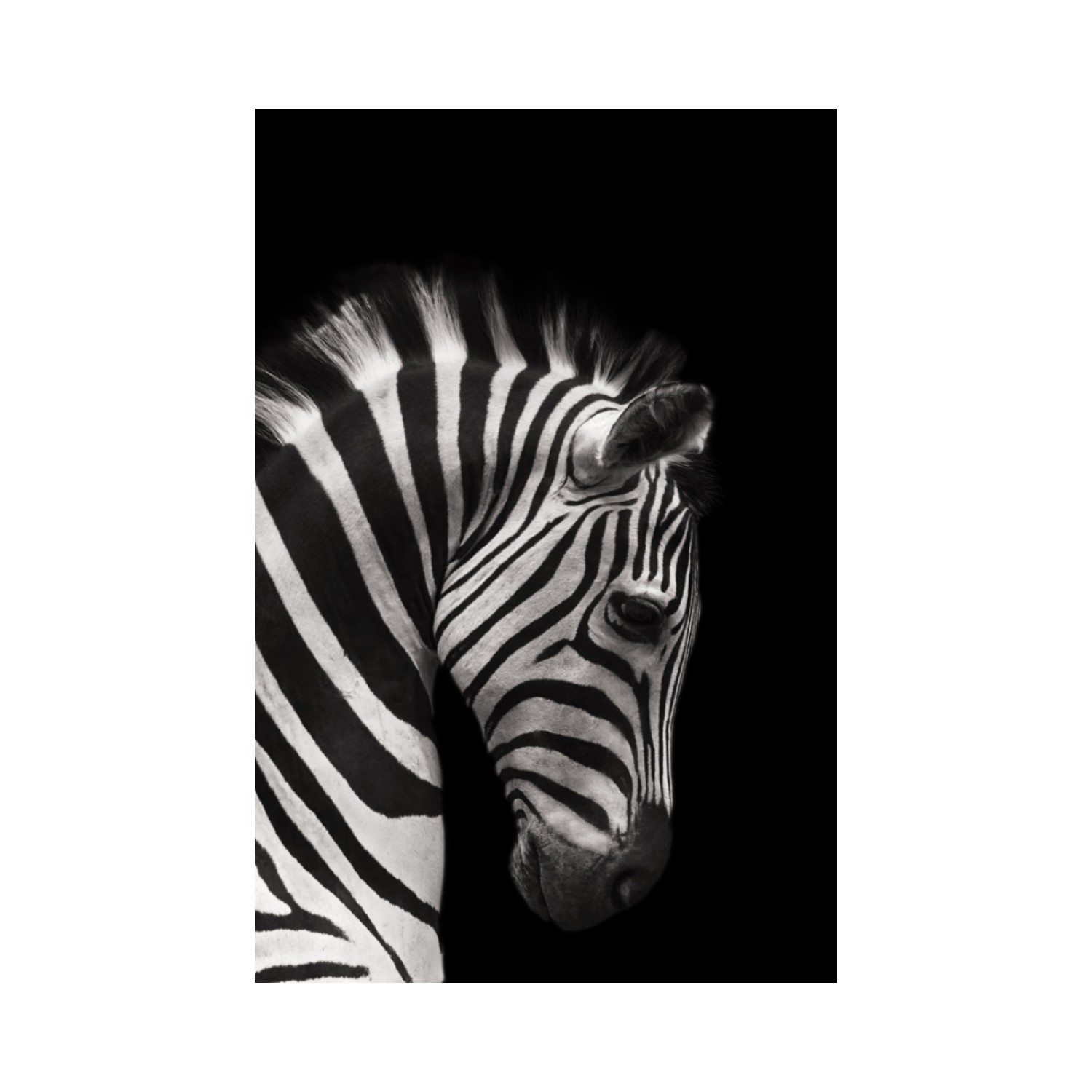 [0] => The Zebra Wall Art is a larger-than-life photographic print of a zebra's head in profile. The black background and dramatic contrast of the zebra's stripes form a sense of starkness and majesty, enhanced by the artwork's generous size. Made of acrylic with a glossy finish, Zebra creates a bold accent for an animal lover's home.