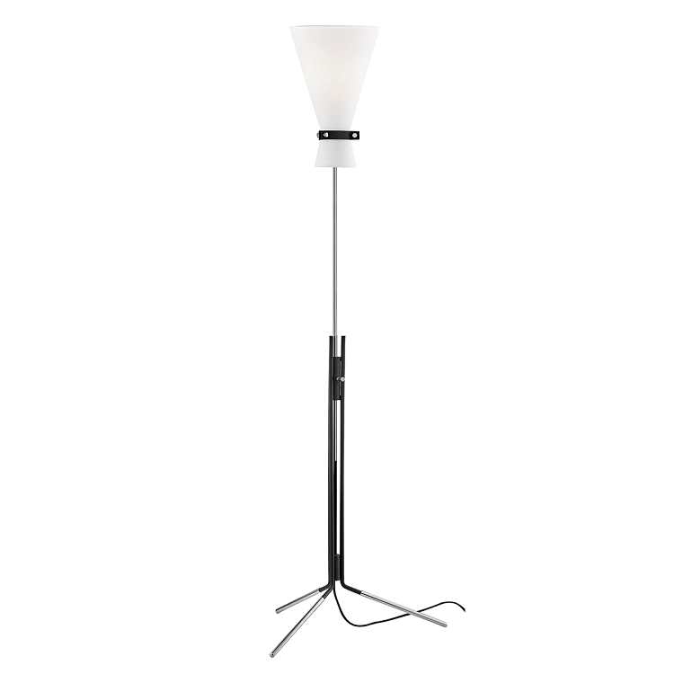 The Zena torchiere floor lamp brings a contemporary twist to mid-century modern design with its jewelry-like cuff that wraps around the base of the linen shade. Zena is retro, chic, and urban with its polished nickel accents and angular metal base.