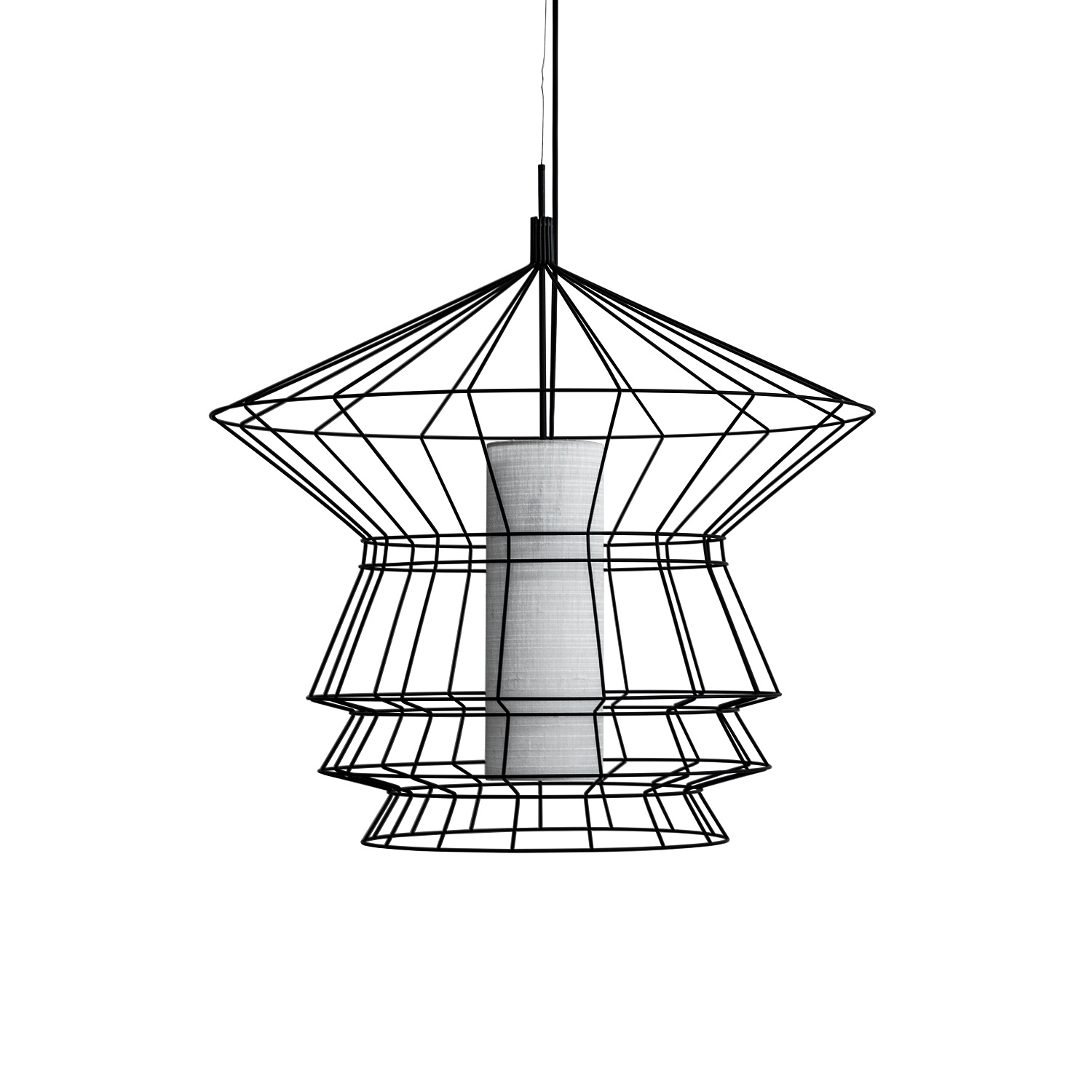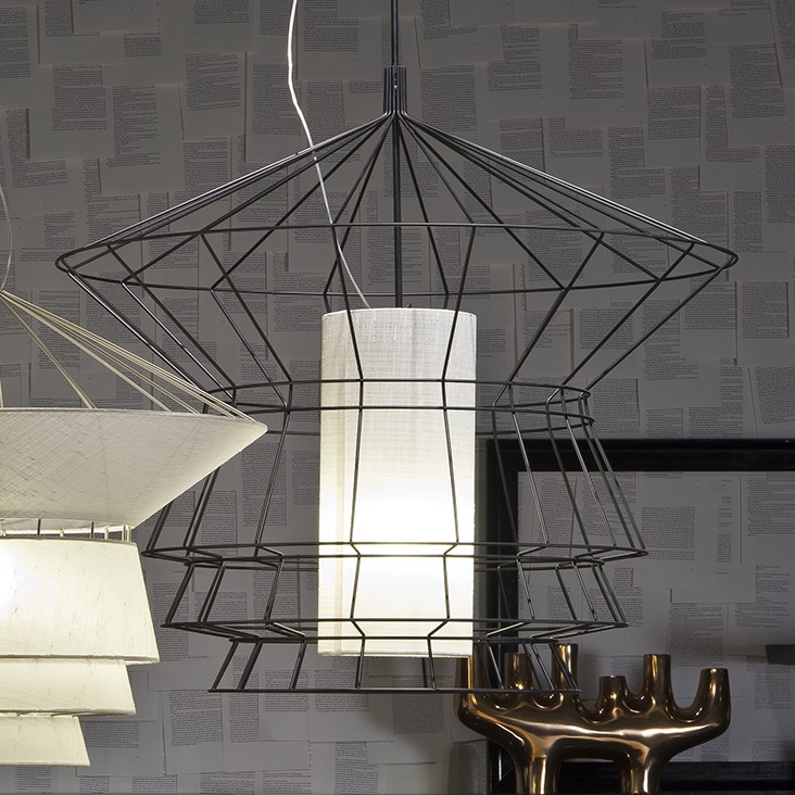 [0] => The Zeppelin pendant lamp, designed by Oriano Favaretto and made in Italy, features an innovative twist on the traditional pendant lamp, with a sculptural black matt metal frame and ivory interior shade. Zeppelin's design emphasizes bold lines and sharp angles and makes a contemporary or midcentury design statement in any space. The lamp is 32'' in diameter.